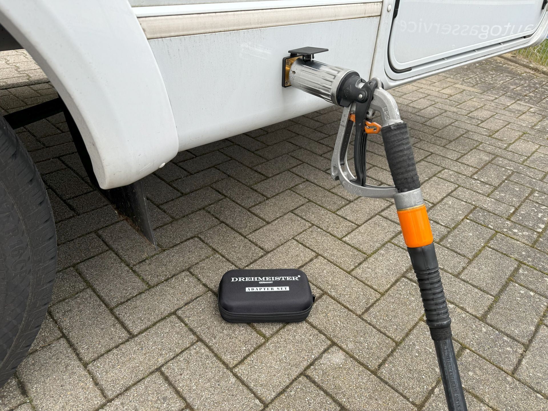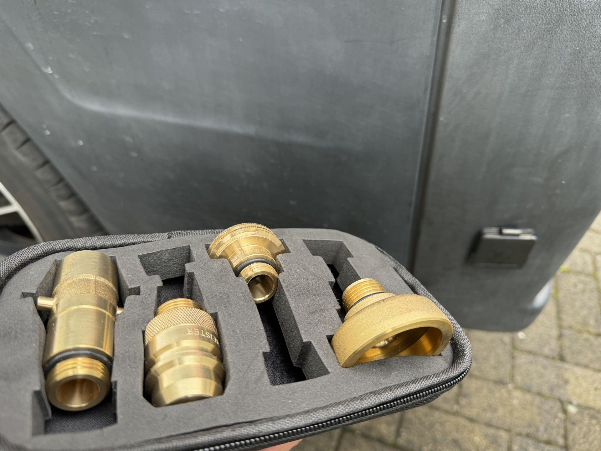 An das geöffnte Betankungsventil wird der passende Tankadapter geschraubt. Bei uns sind bereits alle Adpater dabei