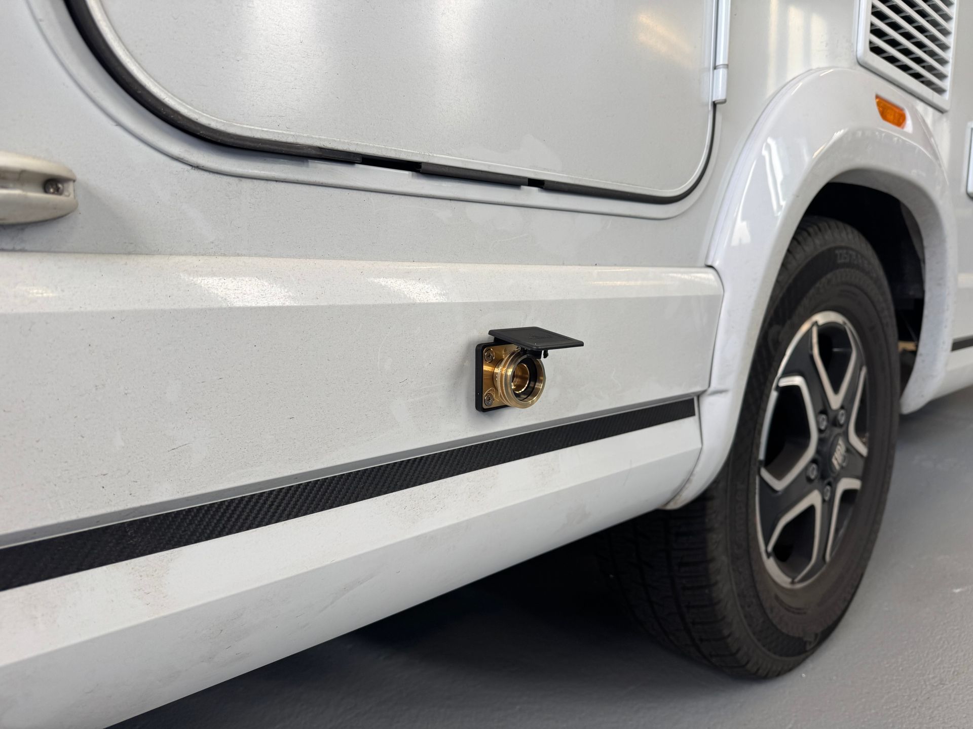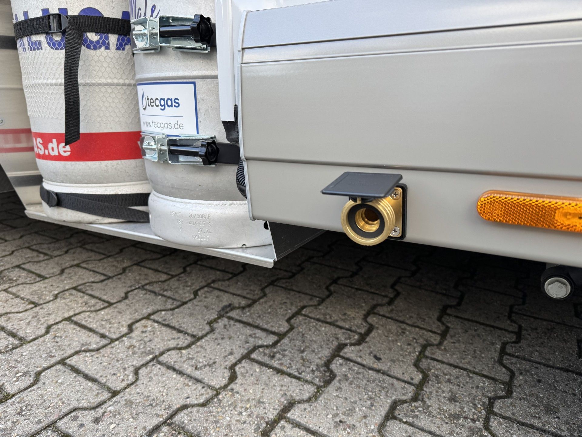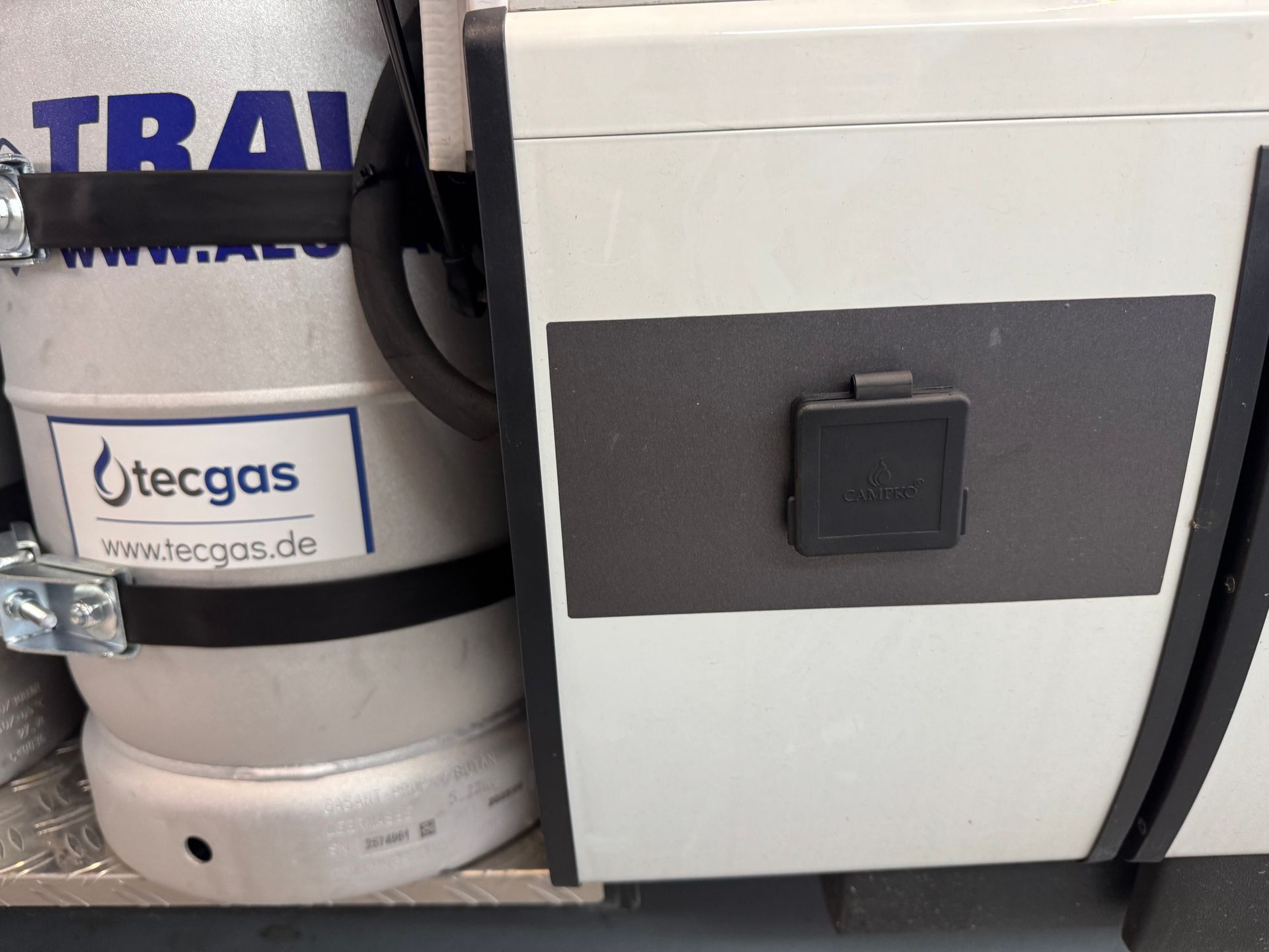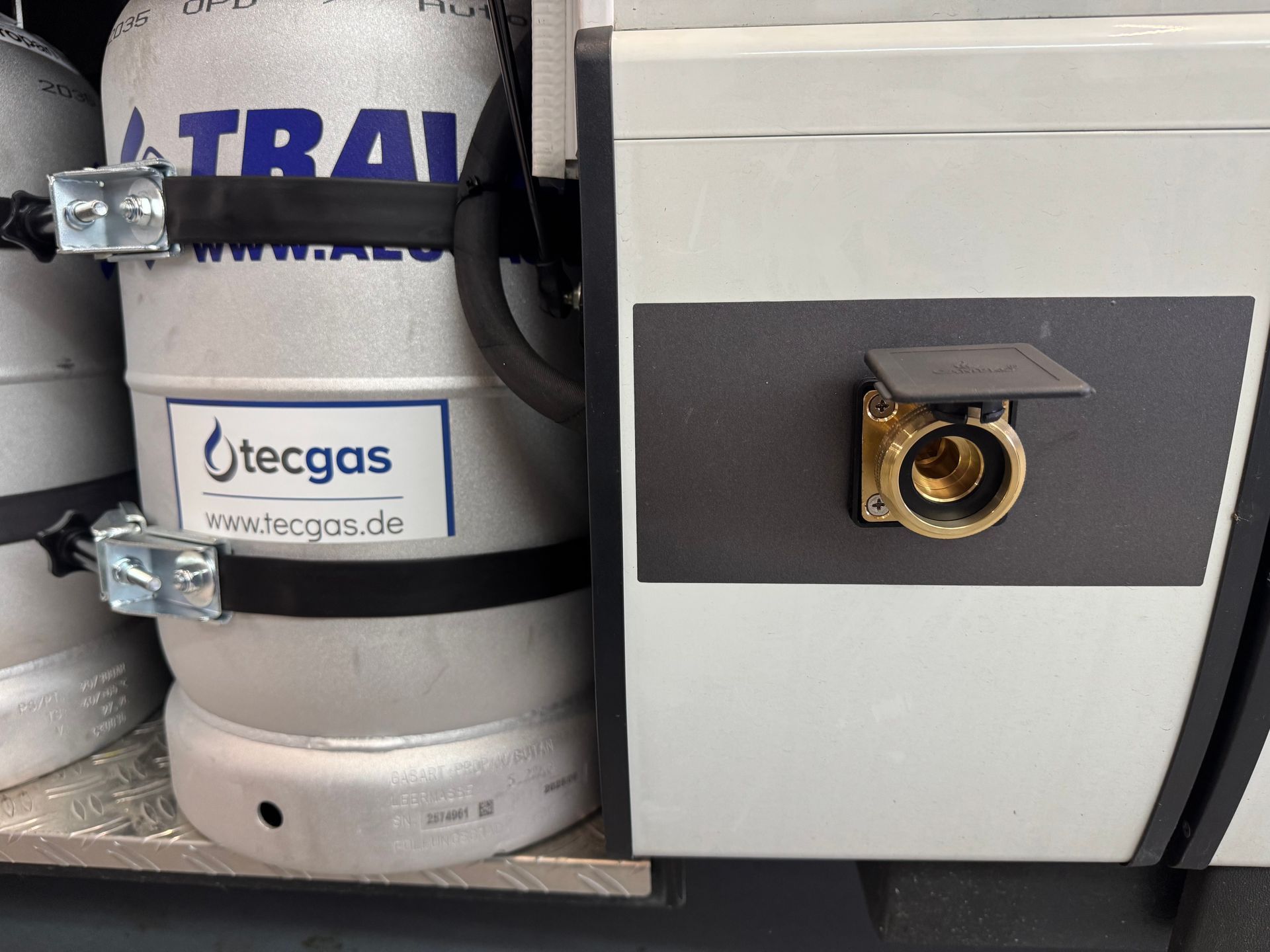 Neben der neuesten Generation der Alugas TRAVEL Mate 2.0 samt ELG Display und Rotarex Bluetooth Modul wurde eine Truma Gasentnahmedose in diesen Le Voyageur verbaut. Sowohl Betankungsventil als auch Gasentnahmedose befinden sich komfortabek neben dem Gaskasten.