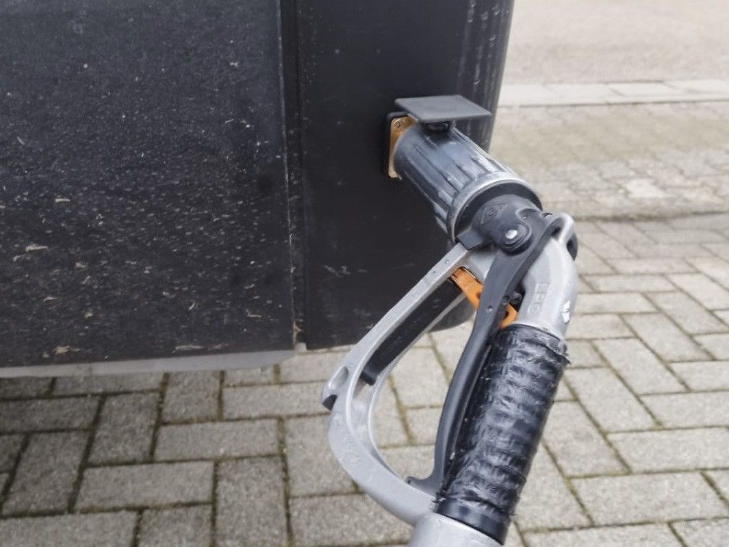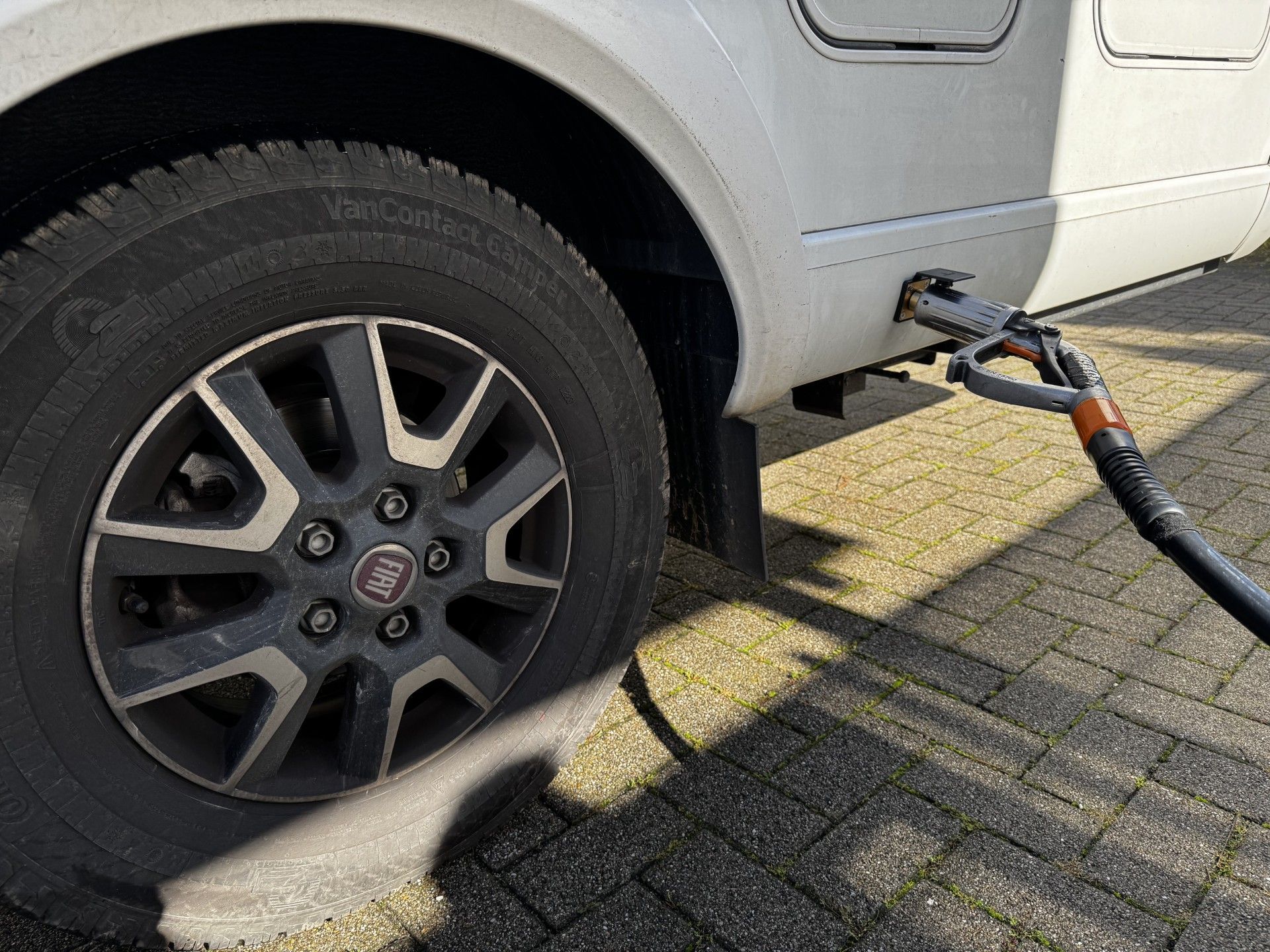 Angeschlossene Tankpistole an Füllventil, neben dem Gaskasten verbaut.