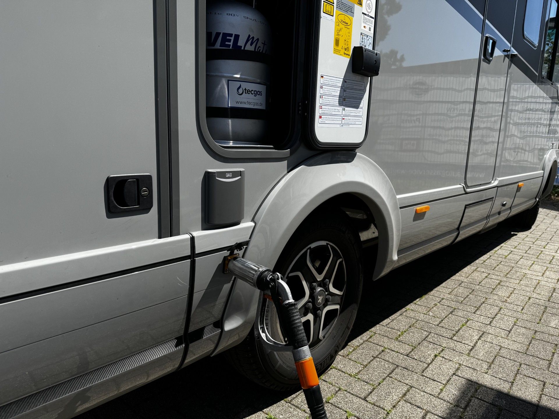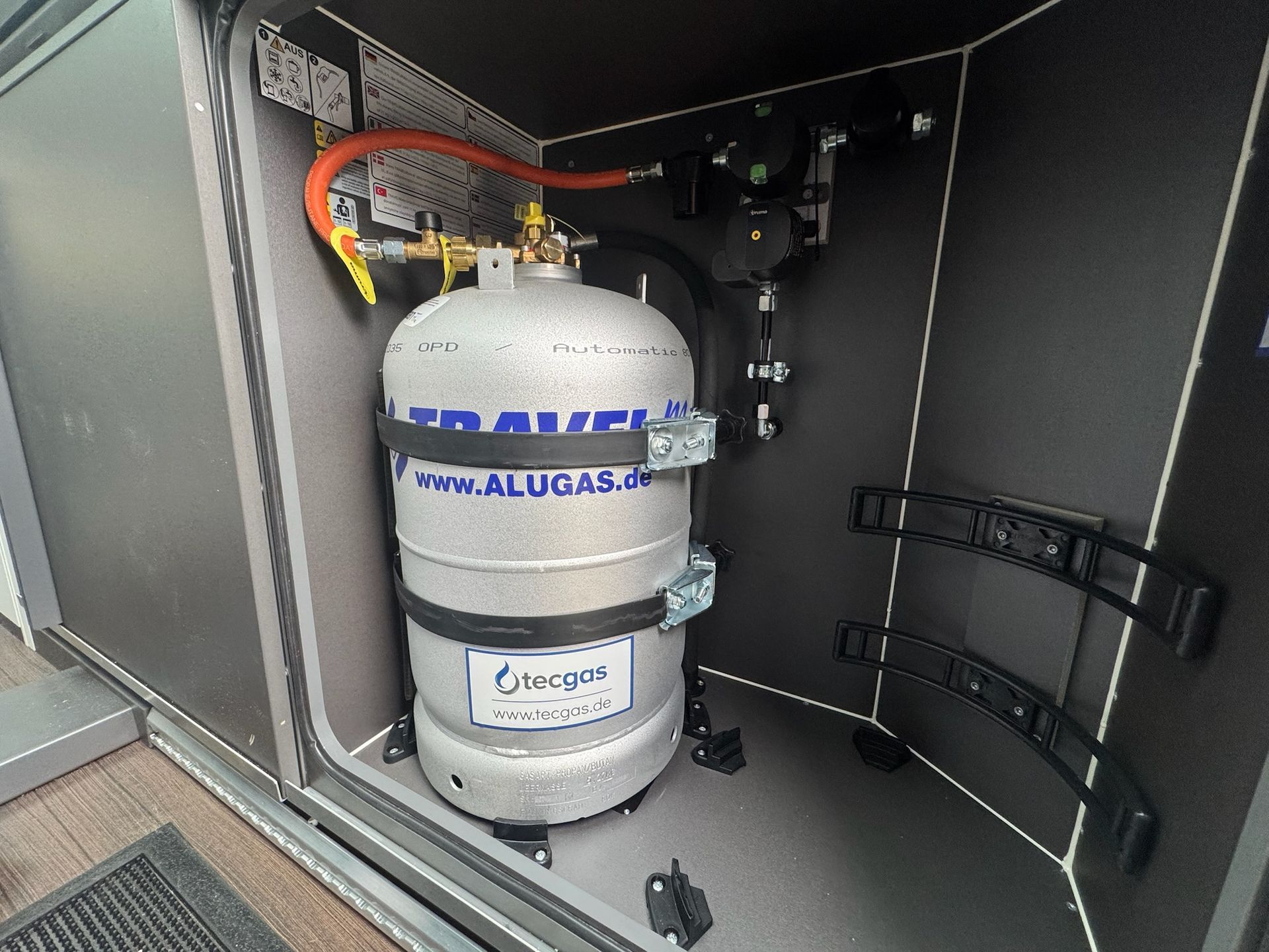 Dieser Niesmann + Bischoff ARTO 85E wurde mit zwei TRAVEL Mate 2.0 Flaschen ausgestattet. Der Füllstand lässt sich bequem und präzise per Smartphone WAVE Bluetooth Box abfragen, welche an dem ELG-Display angeschlossen ist. Das Netto-Füllvolumen beträgt 43,4 Liter.