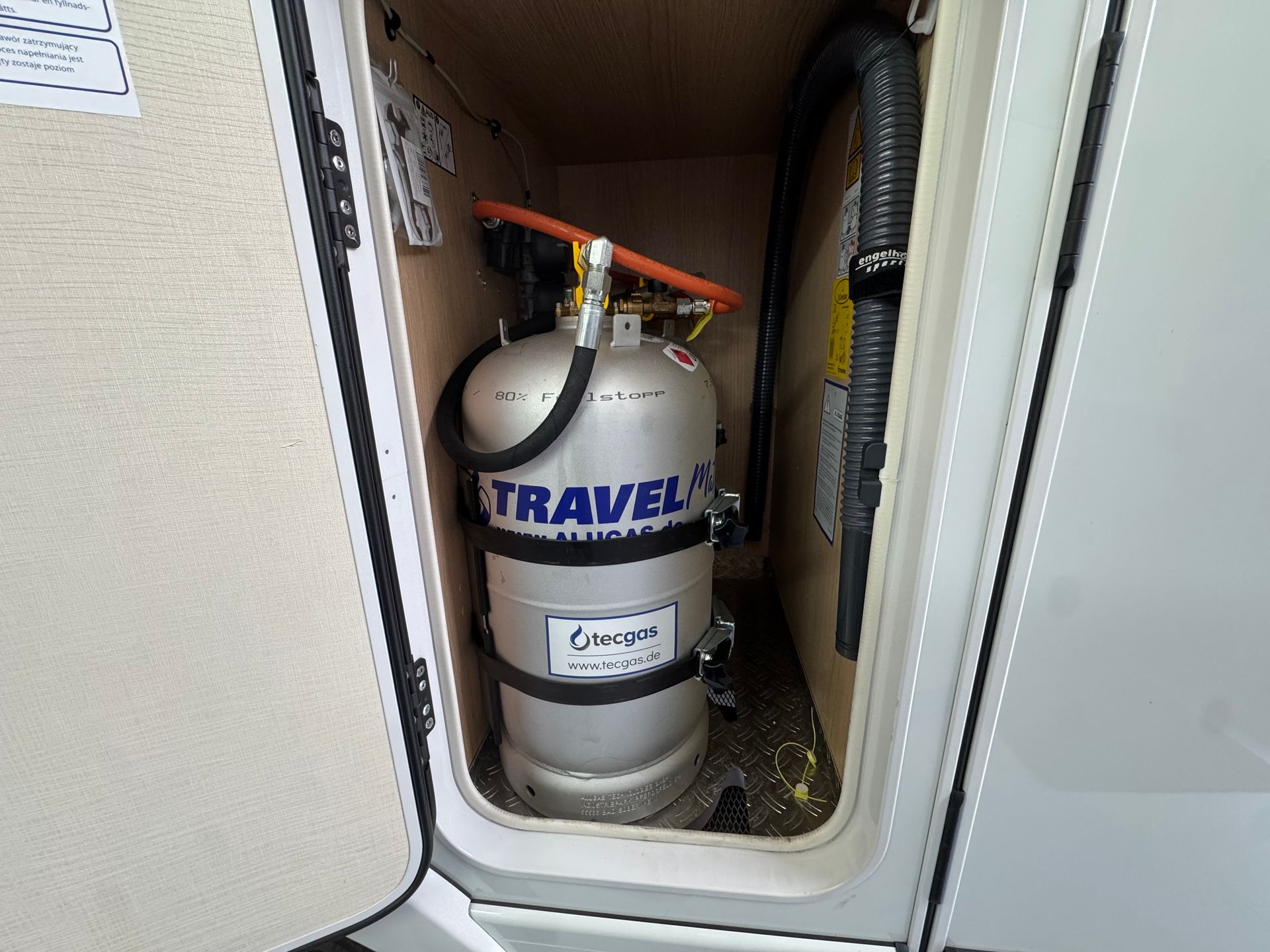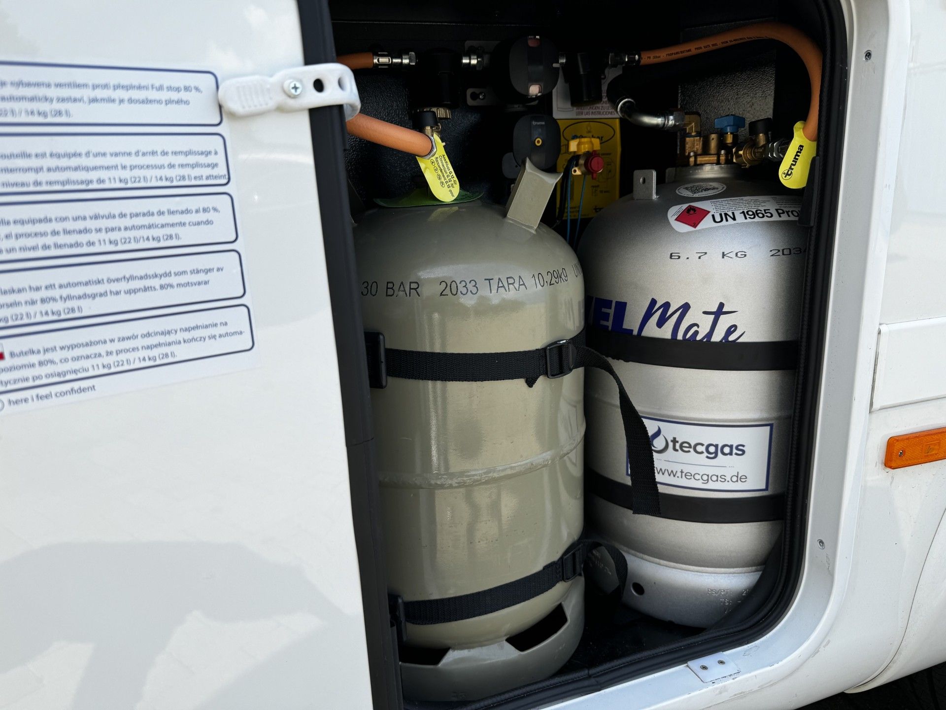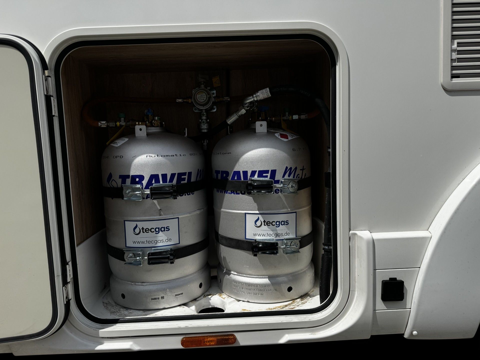 27,2 Liter Alugas TRAVEL Mate im Gaskasten zusamen mit einer Wechselflasche an der DuoControl angeschlossen.