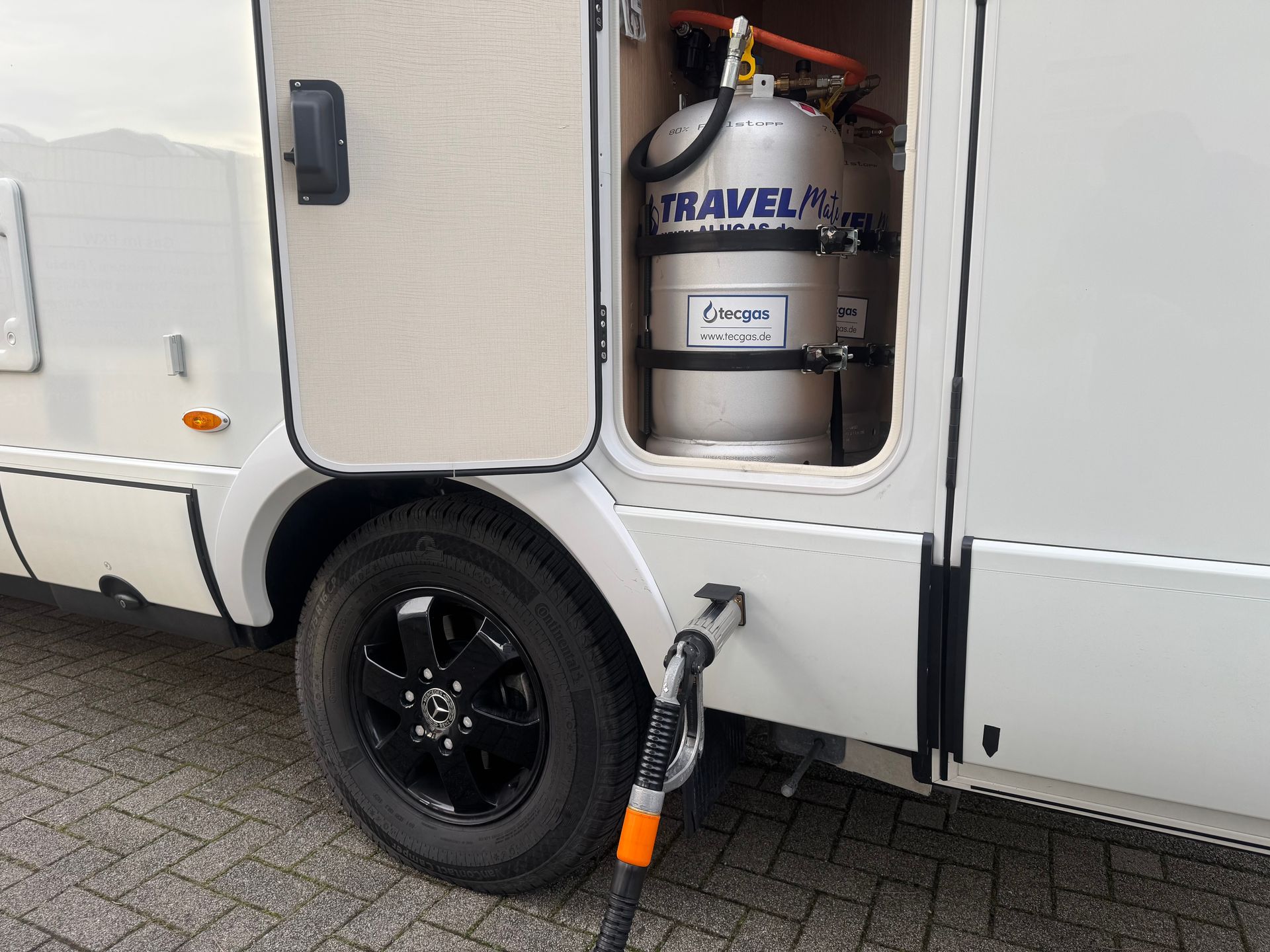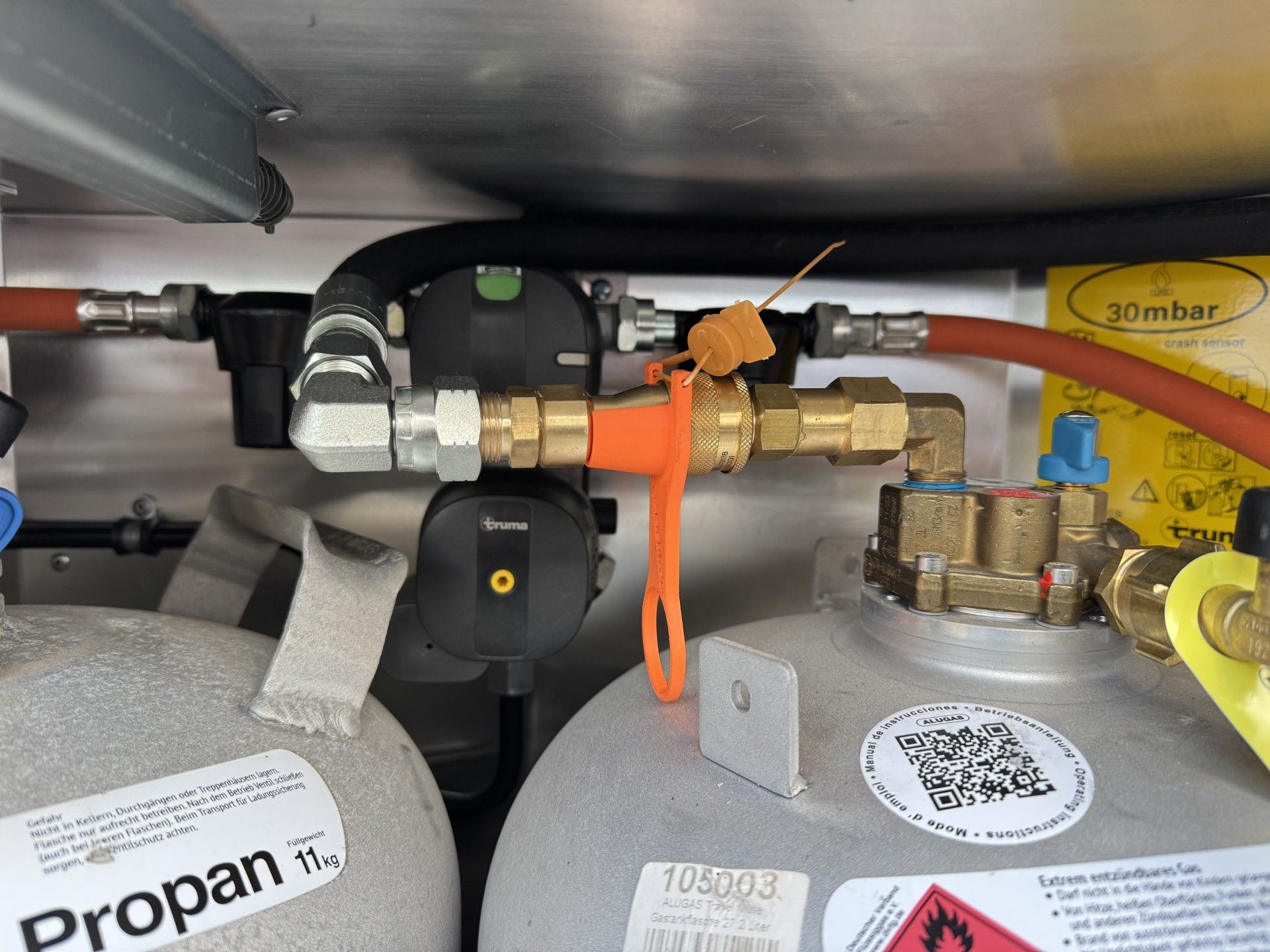 Die beiden Alugas TRAVEL Mate nebeneinander verbaut, der Füllschlauch ist mit der Schnellkupplung angeschlossen