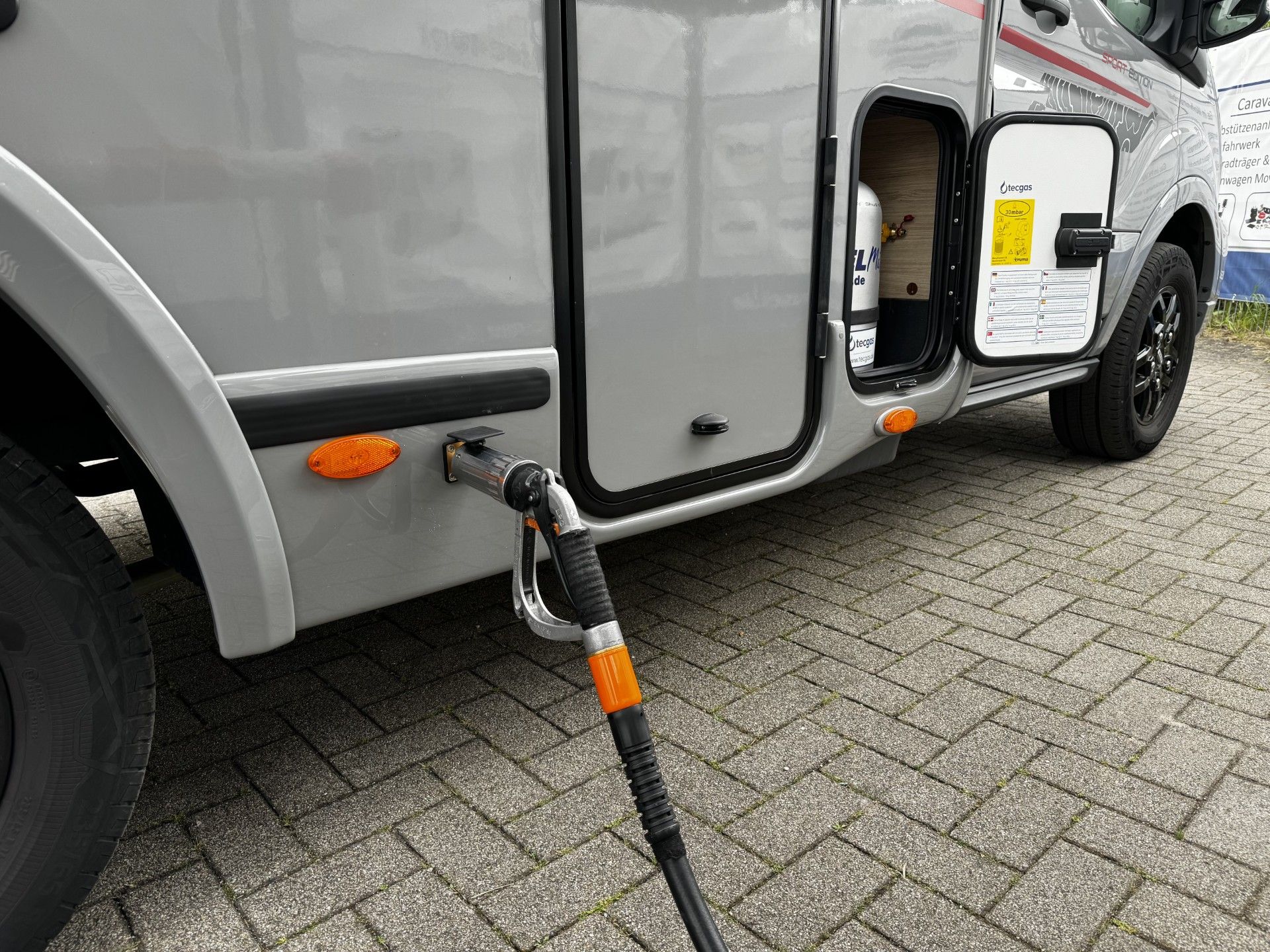 Alugas TRAVEL Mate 1.0 in der 14-kg-Variante verbaut. Damit verfügt der Kunde über einen Gasvorrat von netto 26,6 Litern, der sich bequem an mehr als 30.000 LPG-Tankstellen in ganz Europa auffüllen lässt – ganz ohne das mühsame Schleppen von Gasflaschen. Die Betankung erfolgt komfortabel über das in die Seitenschürze integrierte Füllventil. Für die Versorgung eines Gasgrills oder einer Außenküche wurde zusätzlich eine