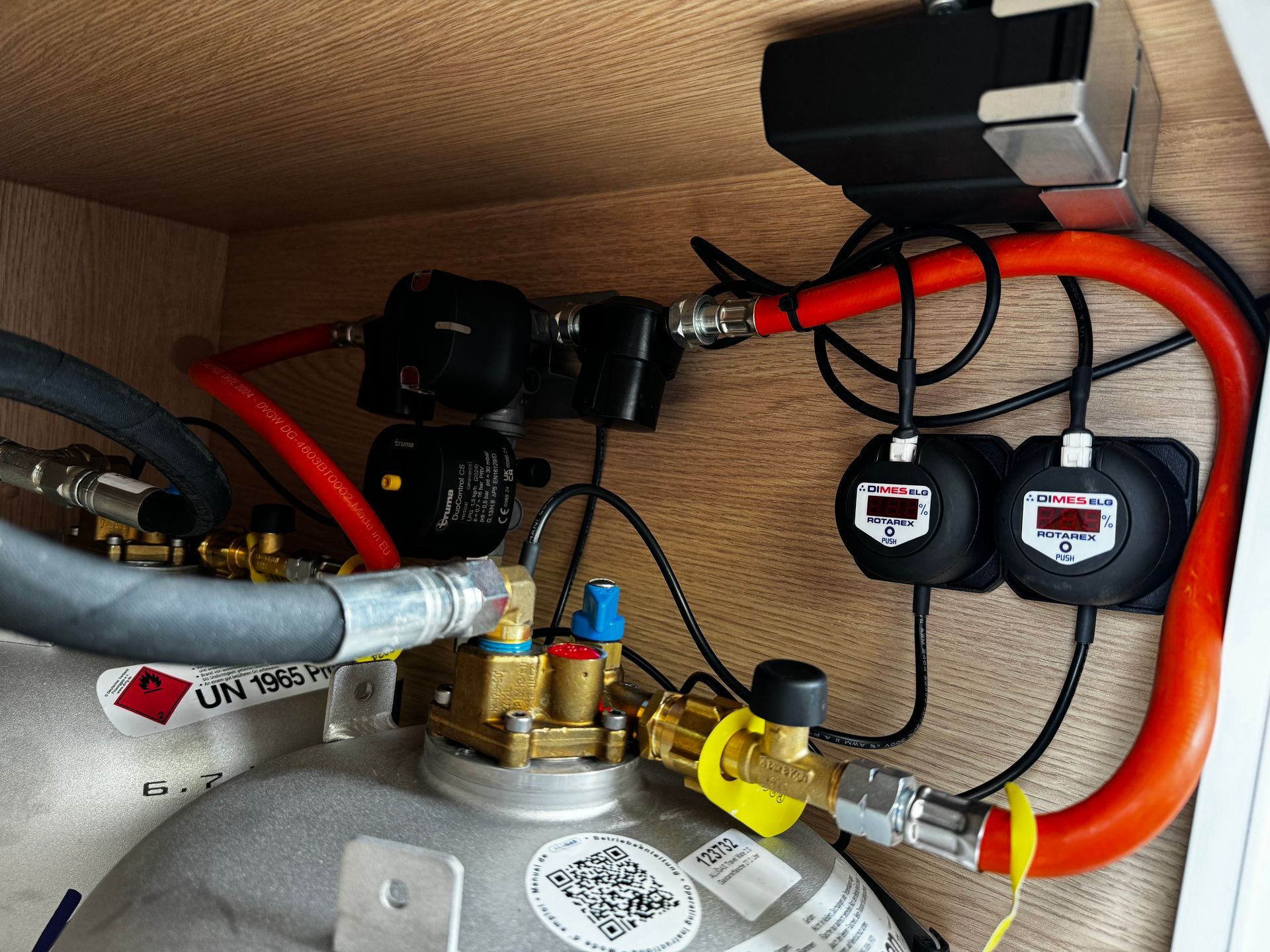 Zwei Alugas TRAVEL Mate 2.0 hintereinander im Gaskasten verbaut. Der Füllstand wird genau und komfortabel am ELG Display an der Seite des Gaskasten angezeigt.