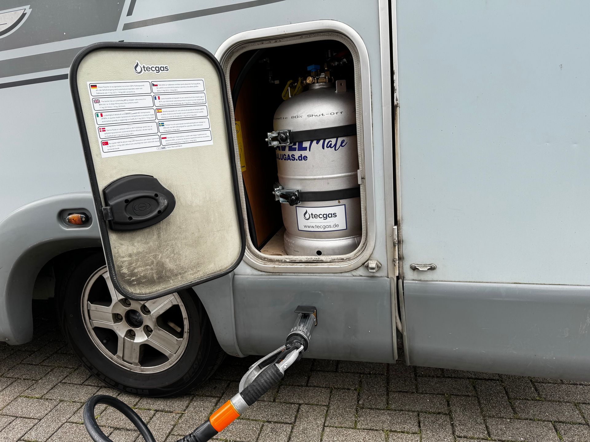 Somit kann man sein Gasvorrat von 53,3 Liter konfortabel an 30.000 LPG Tankstellen in Europa auffüllen.