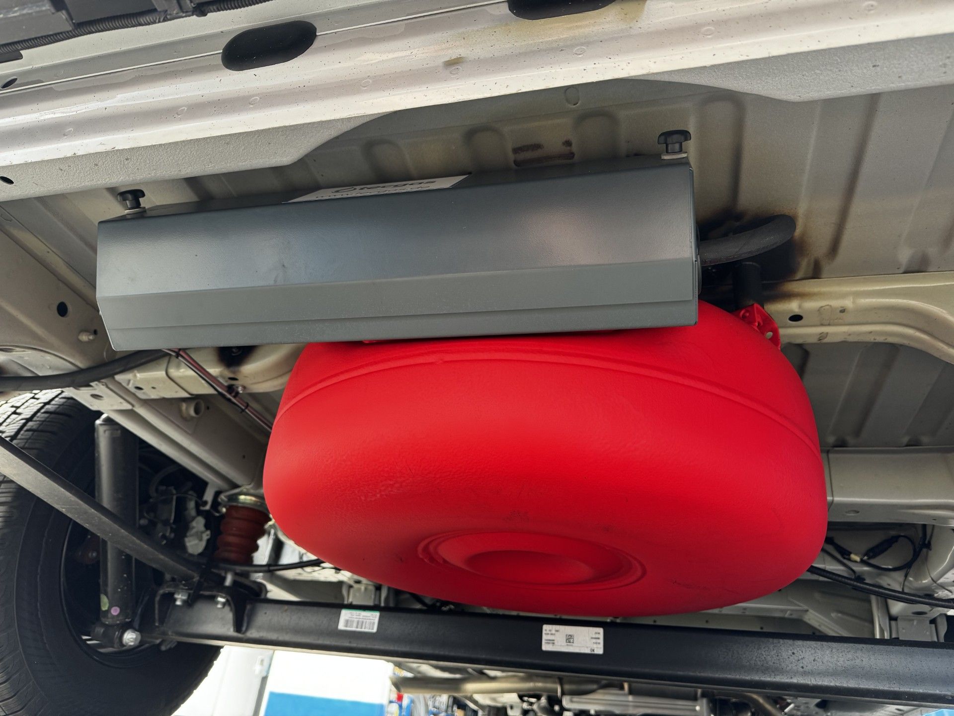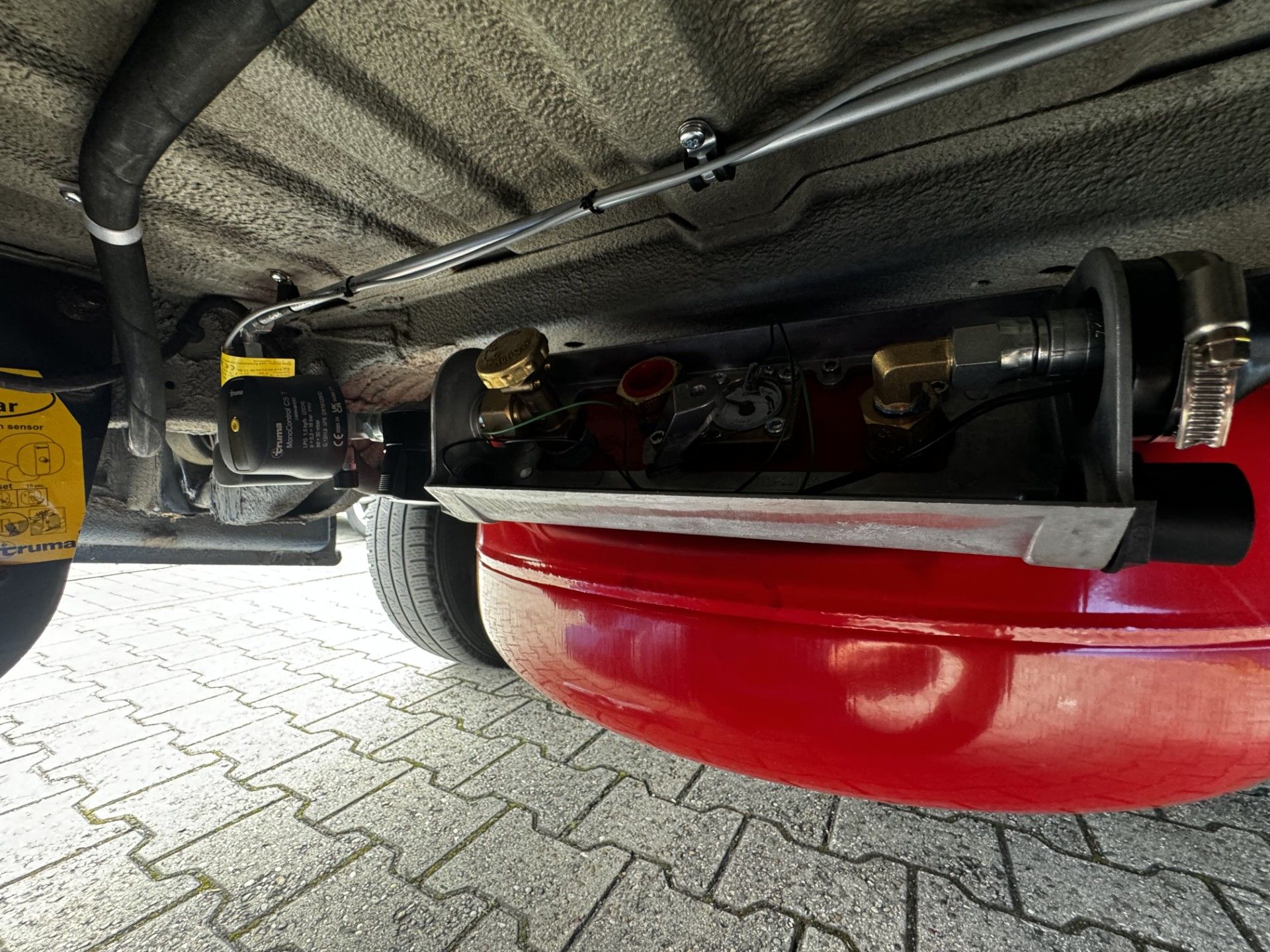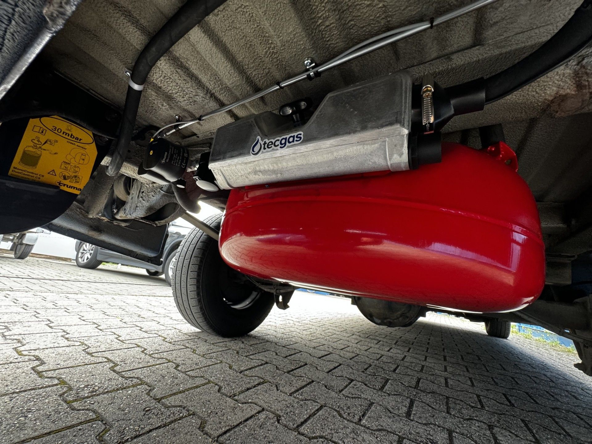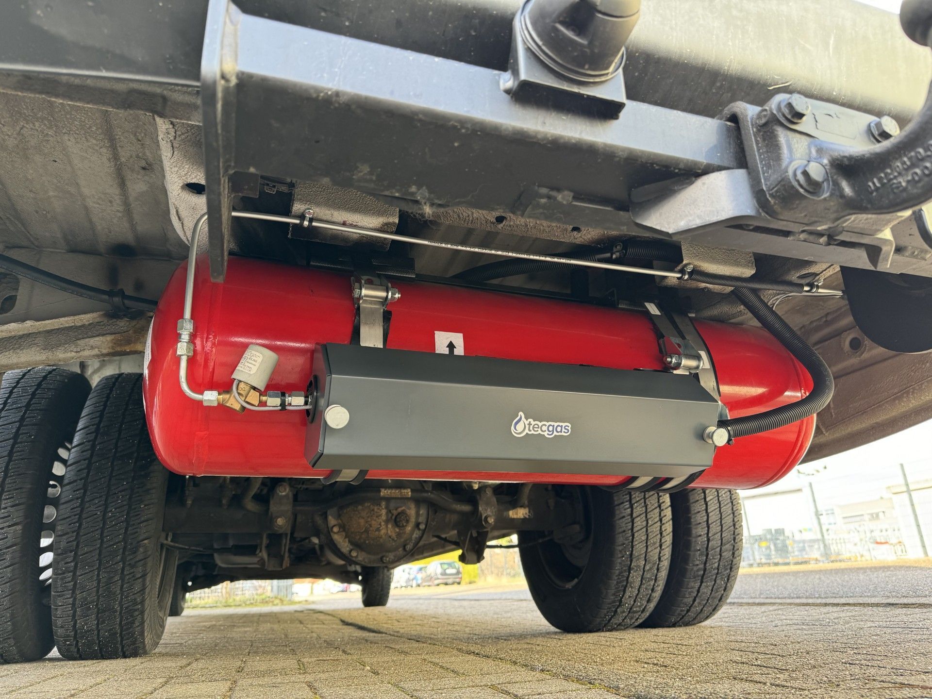 53,5 Liter Toroidal Unterflur hinter der Hinterachse verbaut.Der lange Armaturenkasten schützt Ventile und Druckminderer.