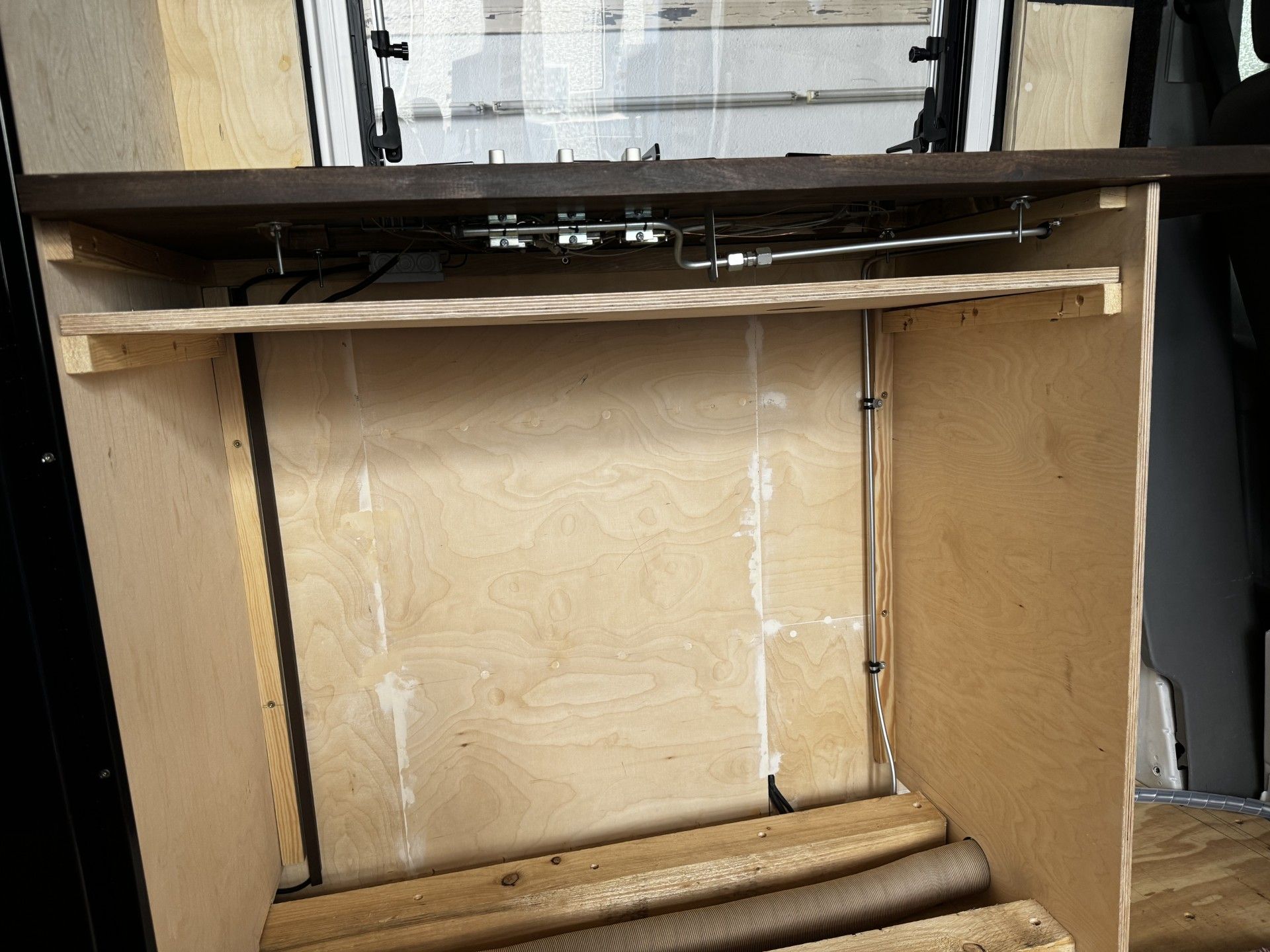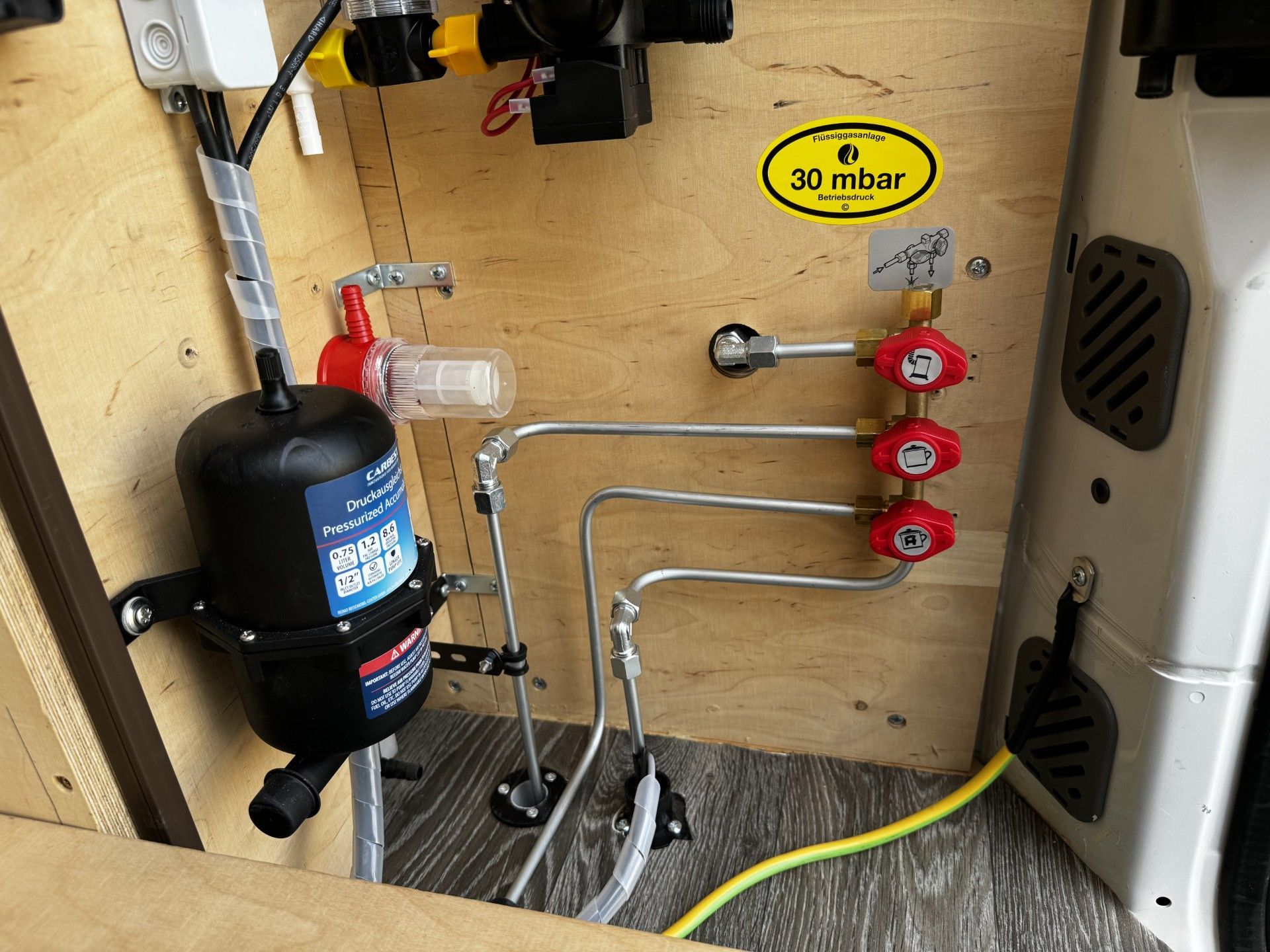 Ventile, Truma Filter und Druckminder sowie das Bluetooth Modul für den Füllstand, sind geschützt im Armaturenkasten verbaut.