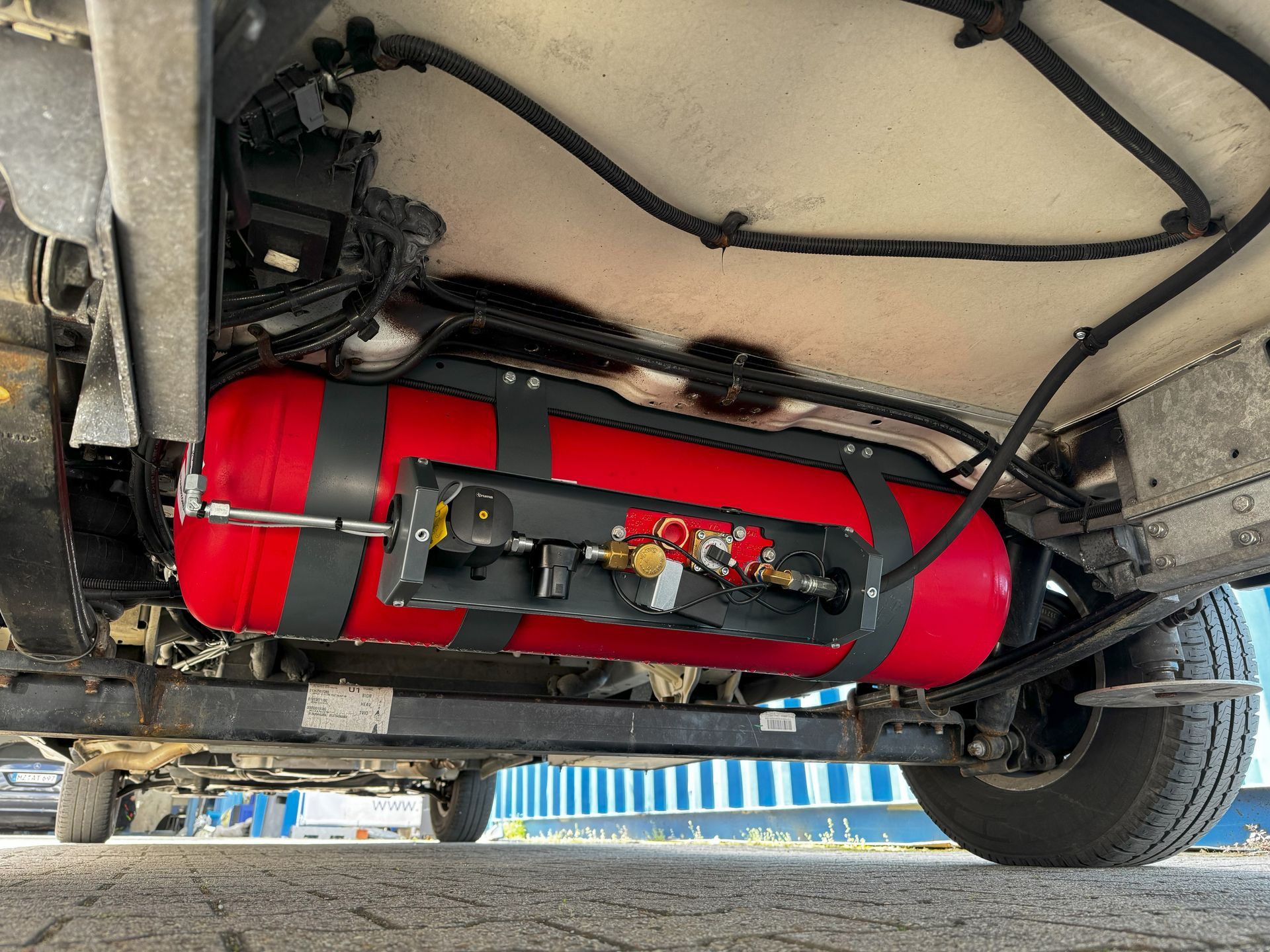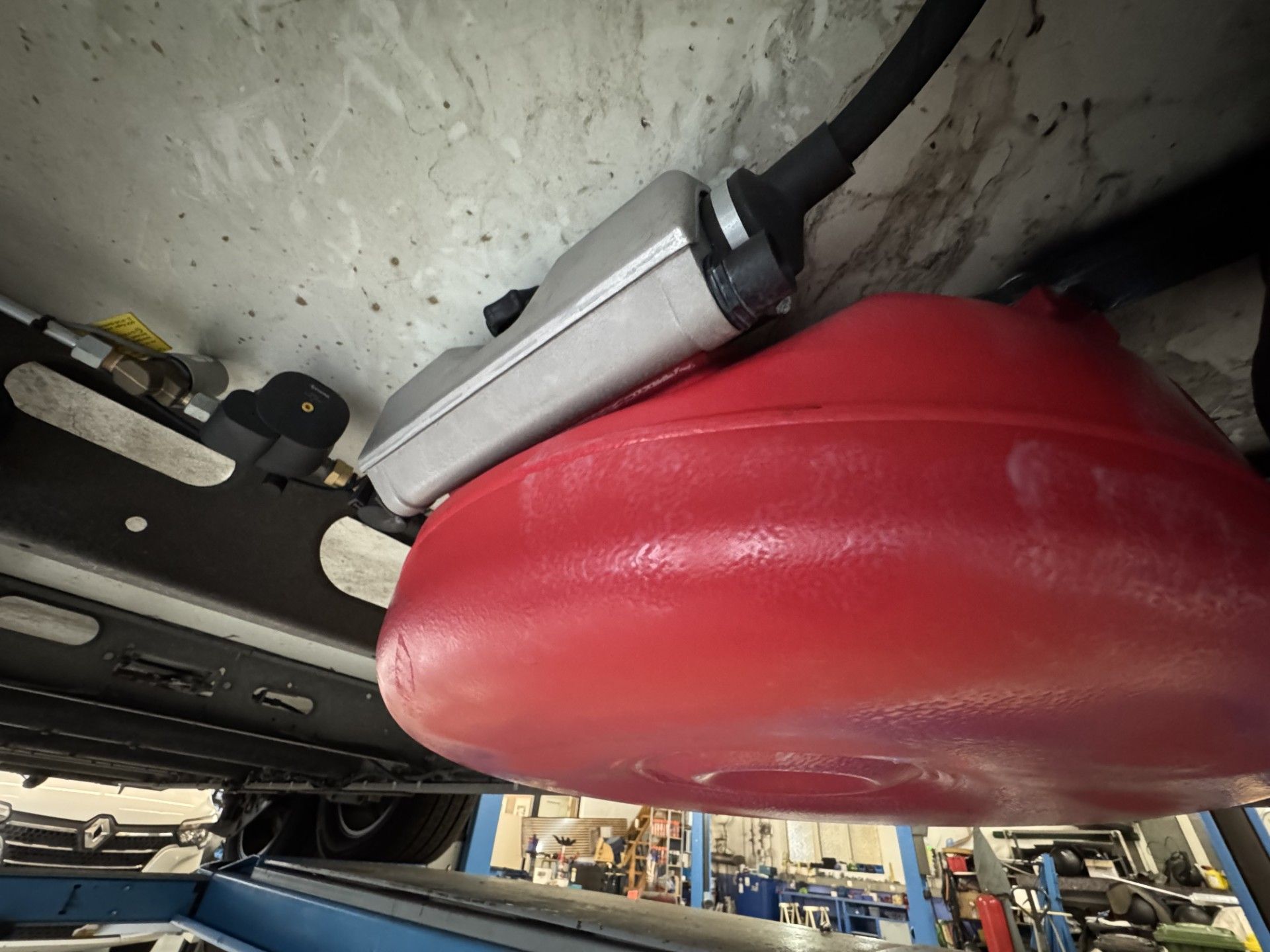 Wir verwenden einen speziell entwickelten Tankhalter der Firma AST, der ohne zusätzliche Bohrungen im Fahrzeugrahmen montiert wird. Dadurch bleibt die Struktur Ihres Fahrzeugs intakt, während gleichzeitig ein großer 70-Liter-Zylindertank sicher befestigt werden kann.