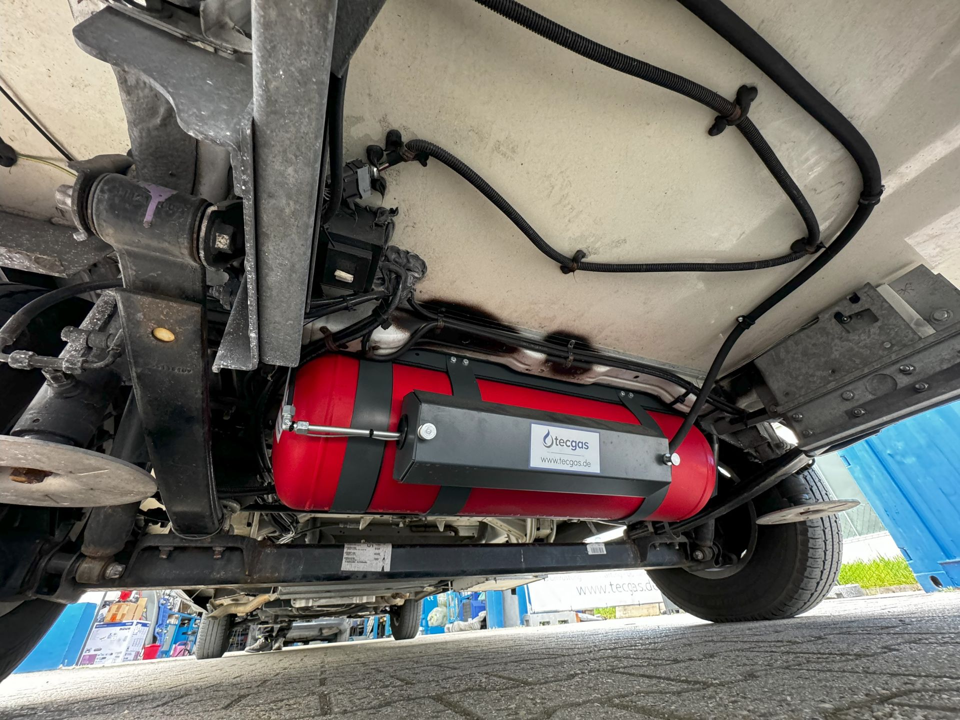 Die Befestigung erfolgt über einen mittig im Fahrgestell verschraubten individuell angefertigten Halter, der an den vorhandenen Bohrungen angebracht wird. Der Tank wird anschließend an diesen Hilfshalter montiert. Zwischen der Gasentnahme und dem Druckminderer wird ein Gasfilter von renommierten Marken wie GOK oder Truma eingesetzt, um die Gasqualität zu sichern. Der Druckminderer ist zudem mit einem Crash-Sensor ausgestattet, der eine sichere Gasentnahme während der Fahrt ermöglicht. Optional kann ein Eis-Ex für den Betrieb bei niedrigen Temperaturen hinzugefügt werden.