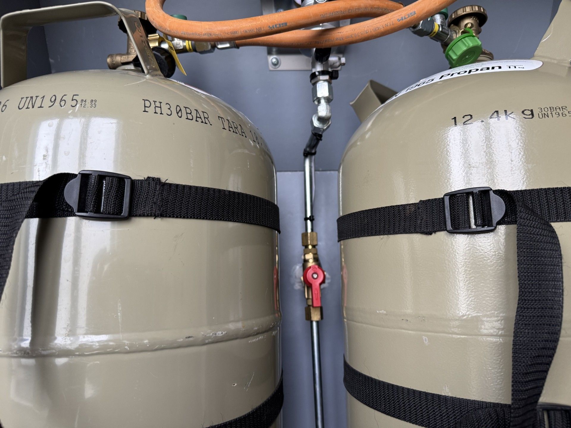 Das im Gasksten montierte Umschaltventil ermöglicht ein Umschalten zwischen Gastank und Gasflaschen.