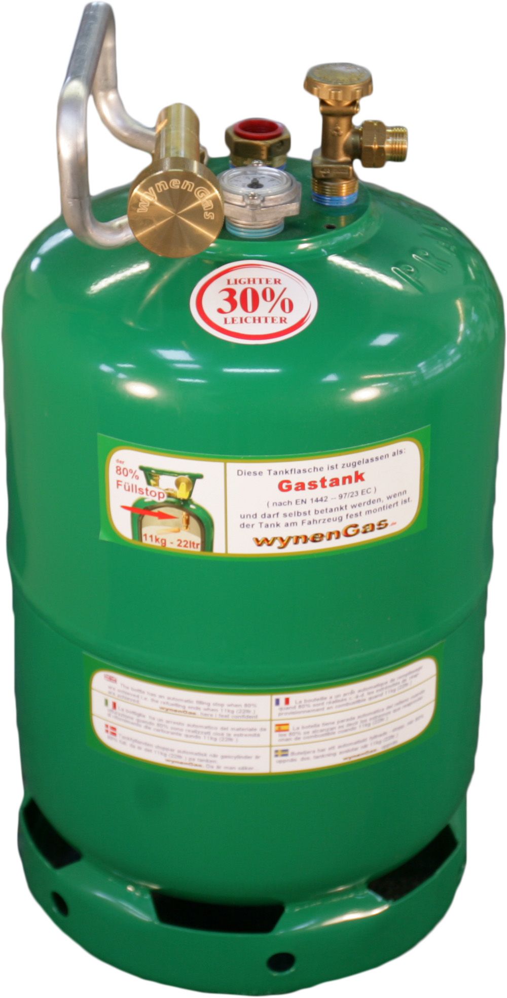 - Gastankflasche: Diese ähnelt in Form und Größe den üblichen Wechselflaschen, verfügt jedoch über ein Füllstopp- und Entnahmeventil. Das Füllvolumen entspricht dem einer Wechselflasche.