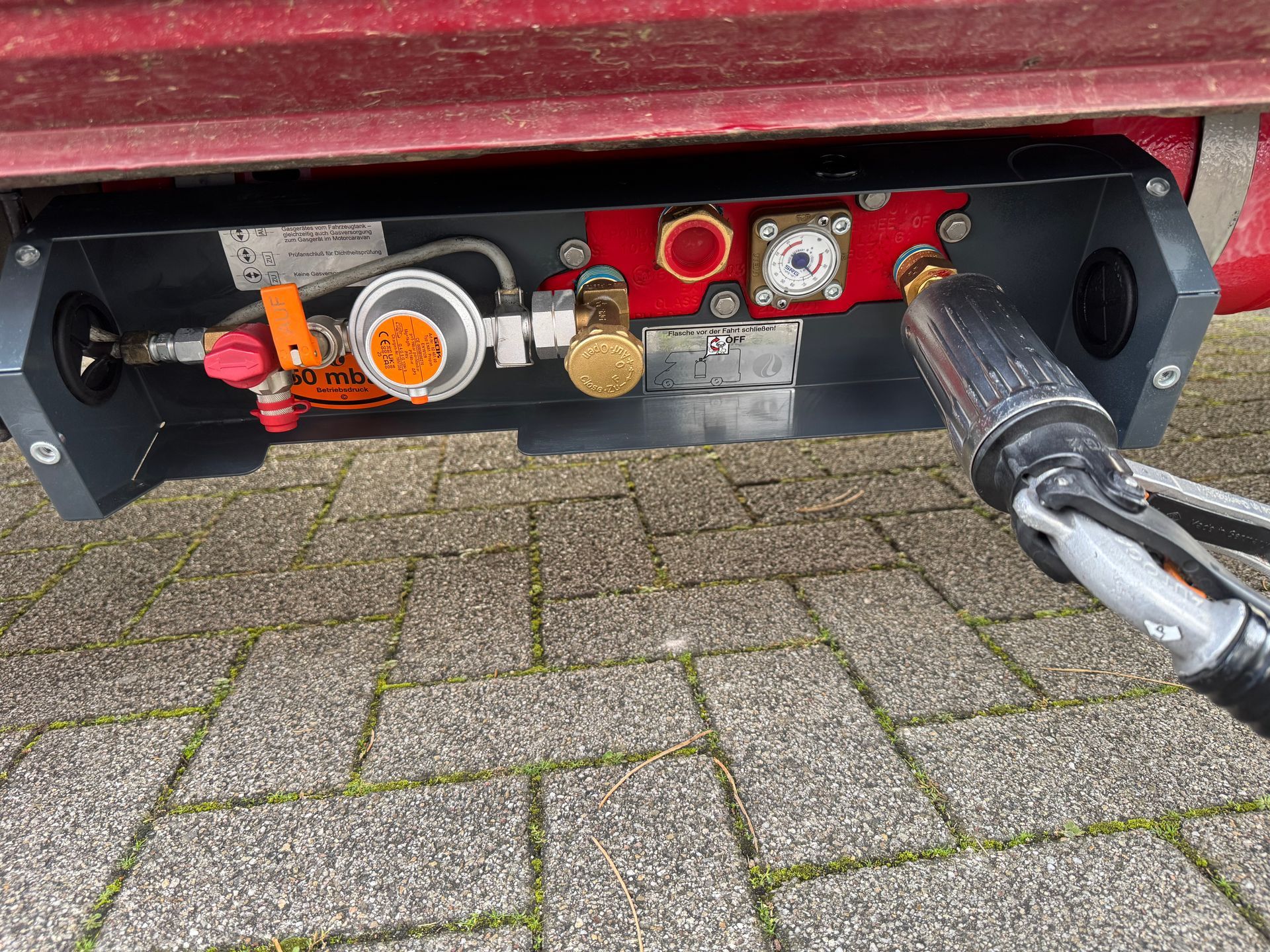 Verbaut wurde ein längerer Gasarmaturenkasten zum Schutz von Ventilen und Druckminderer.