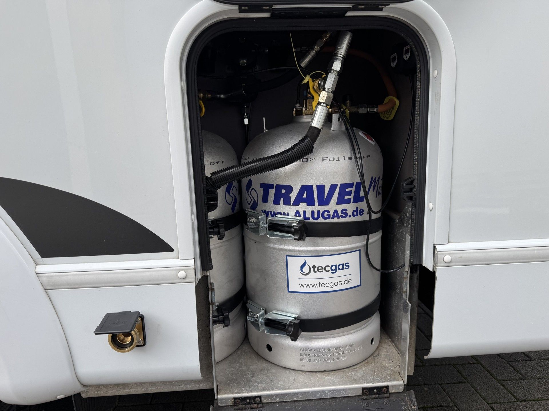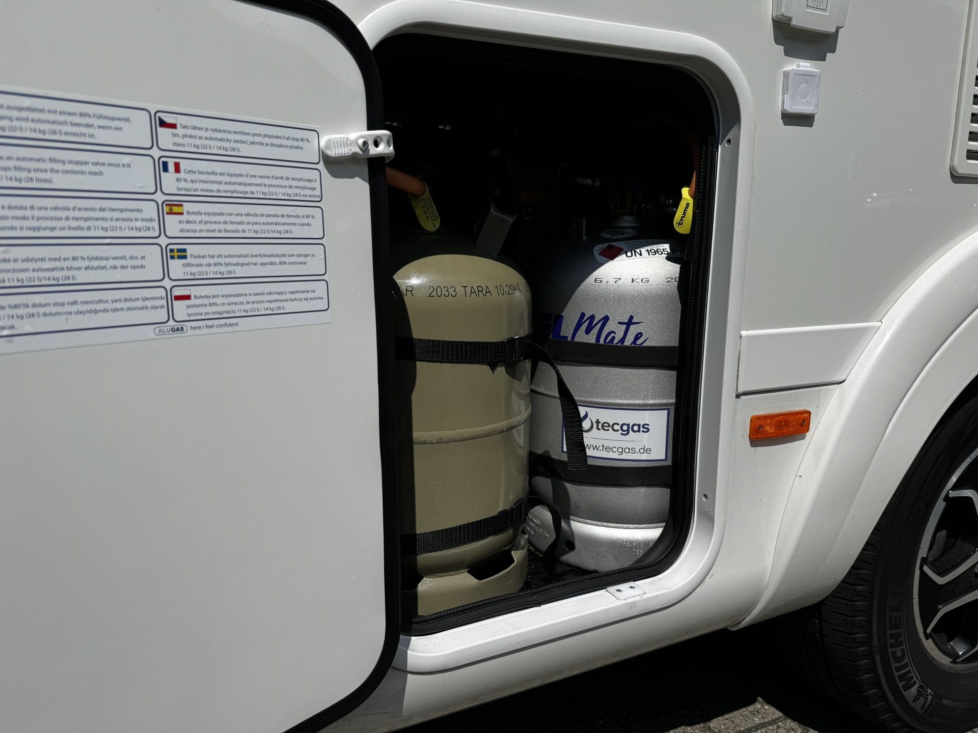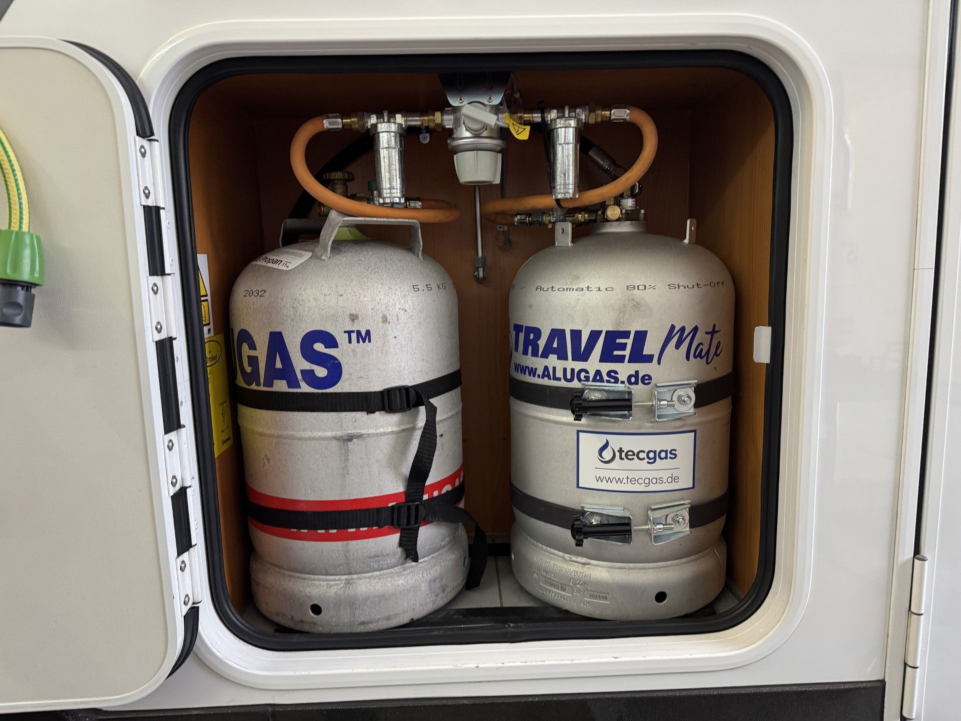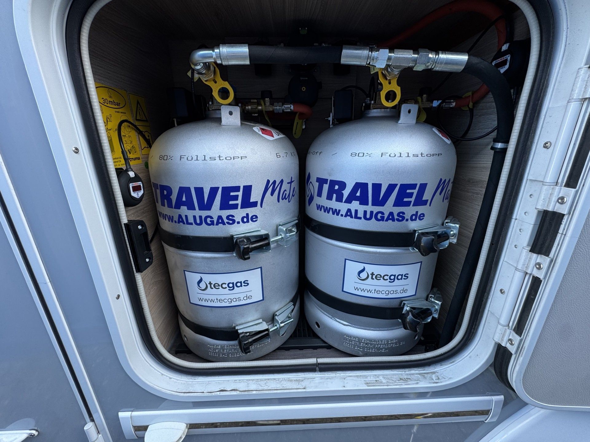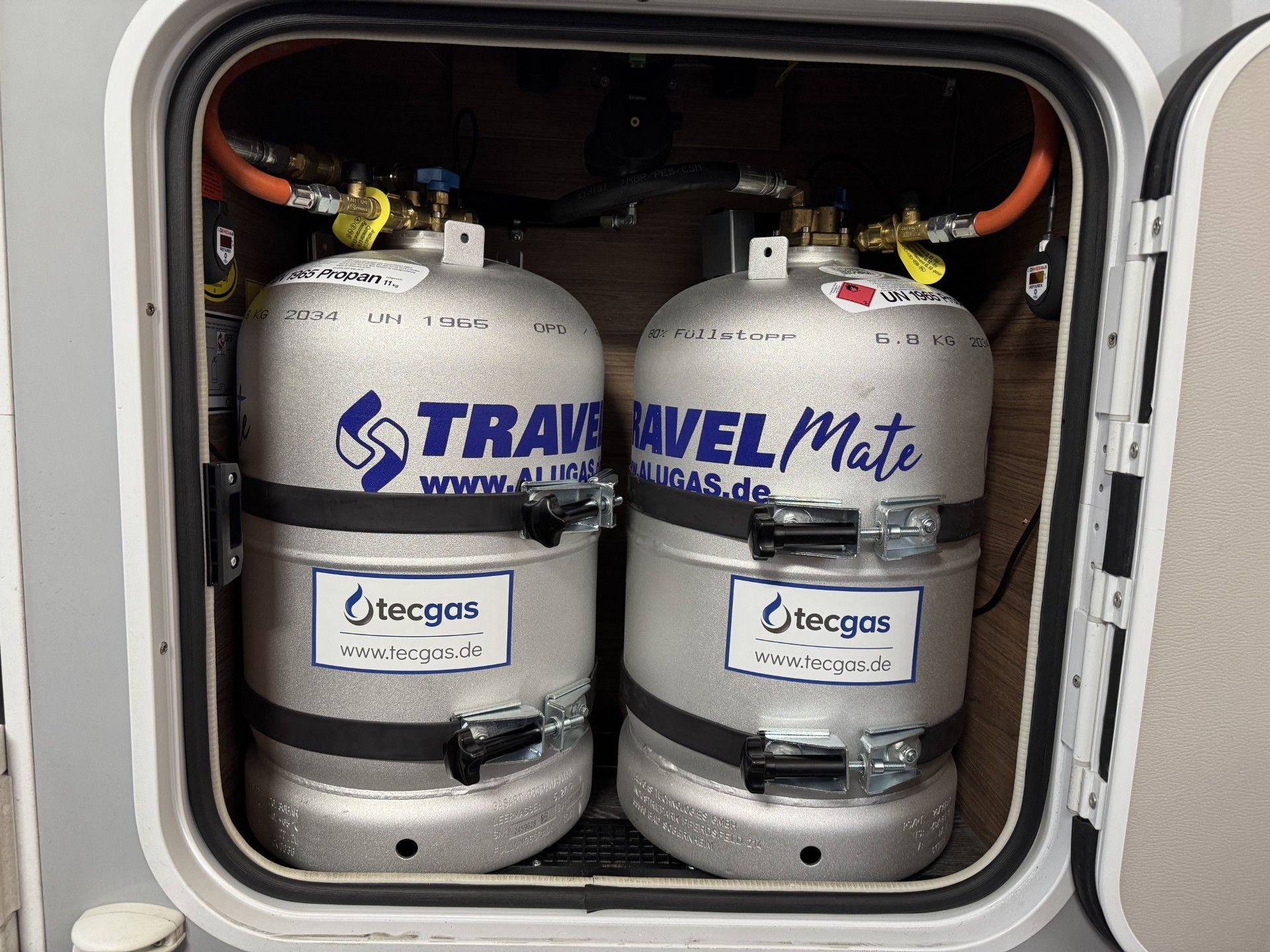 27,2 Liter Alugas TRAVEL Mate im Gaskasten zusamen mit einer Wechselflasche an der DuoControl angeschlossen.