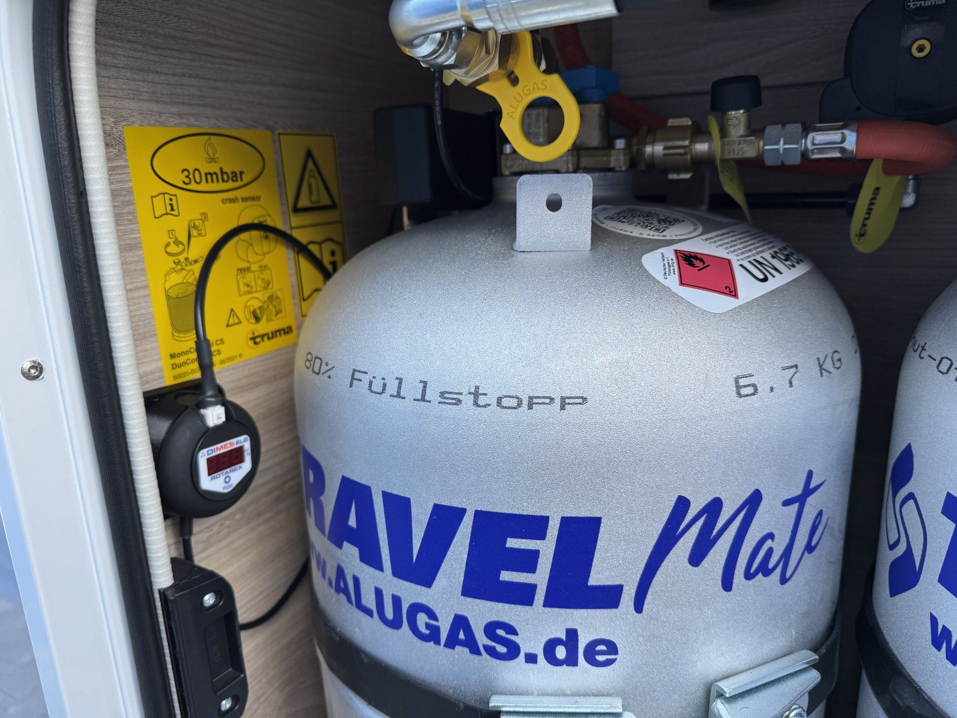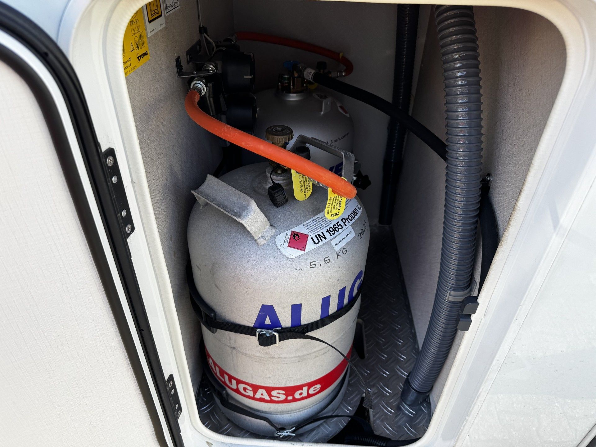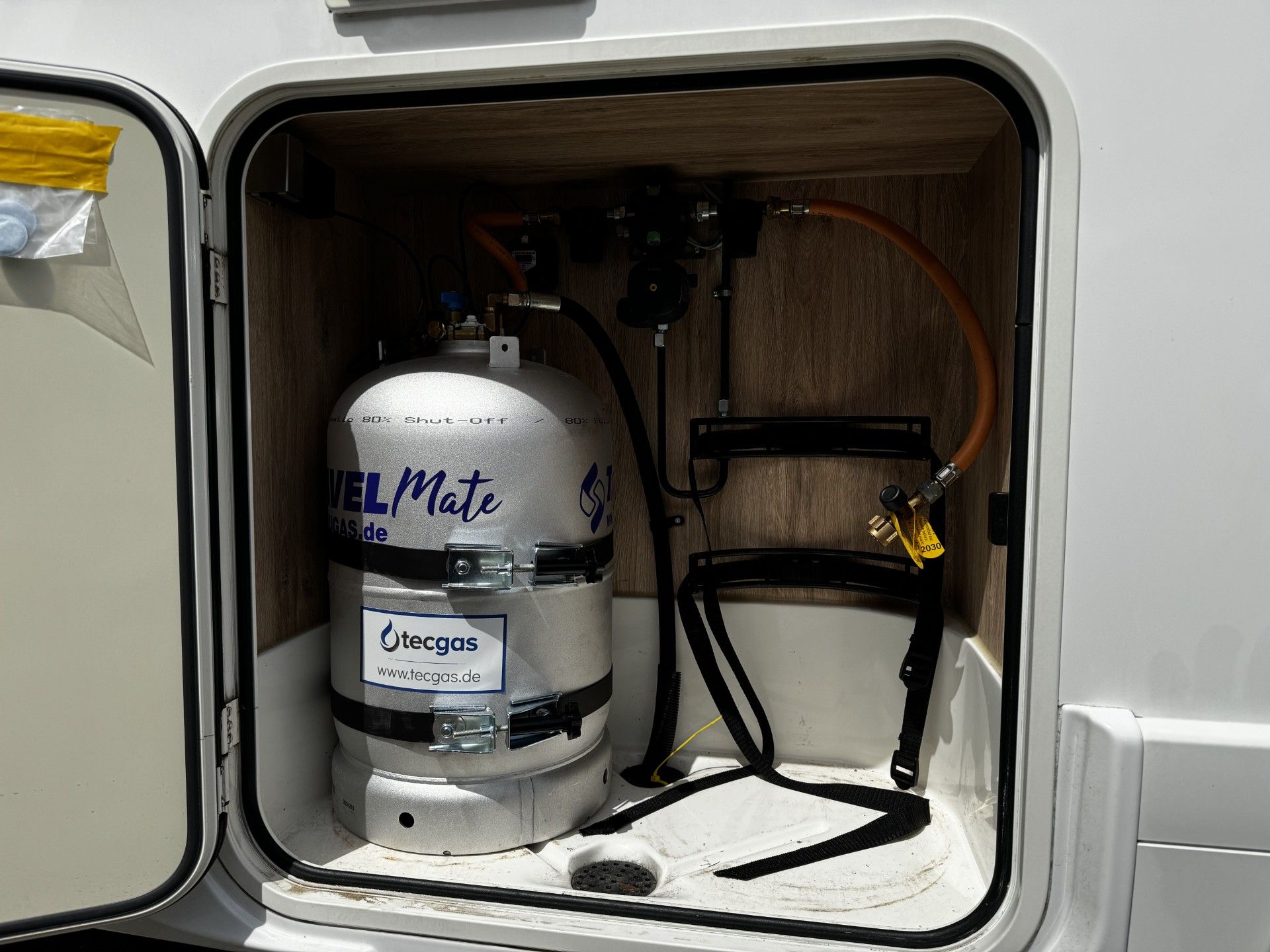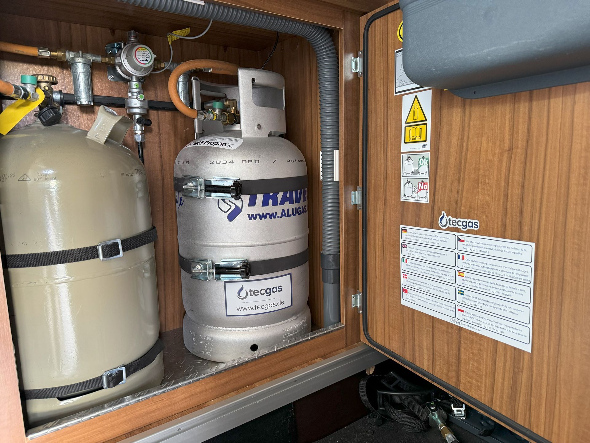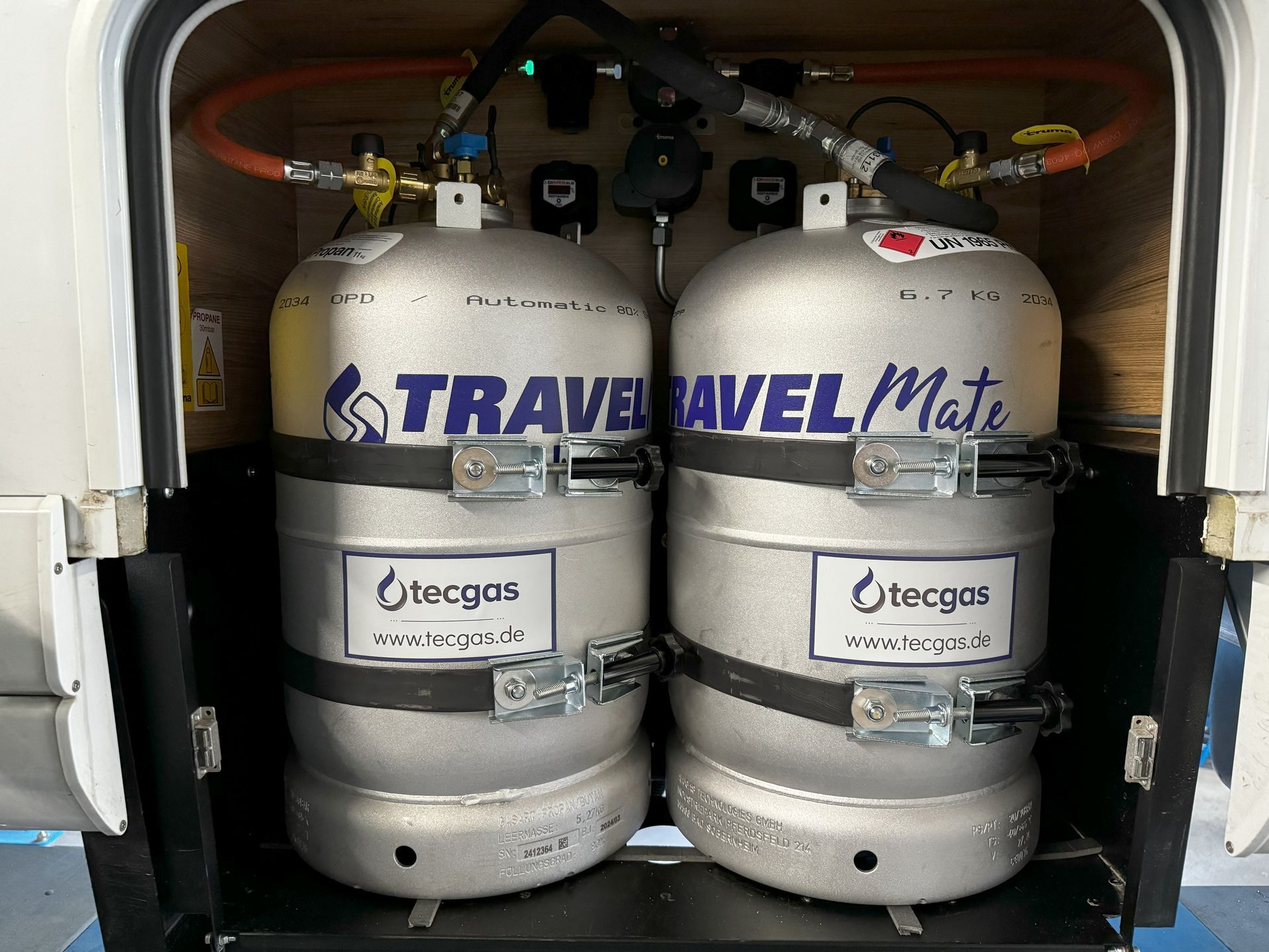 27,2 Liter Alugas TRAVEL Mate im Gaskasten zusamen mit einer Wechselflasche an der DuoControl angeschlossen.