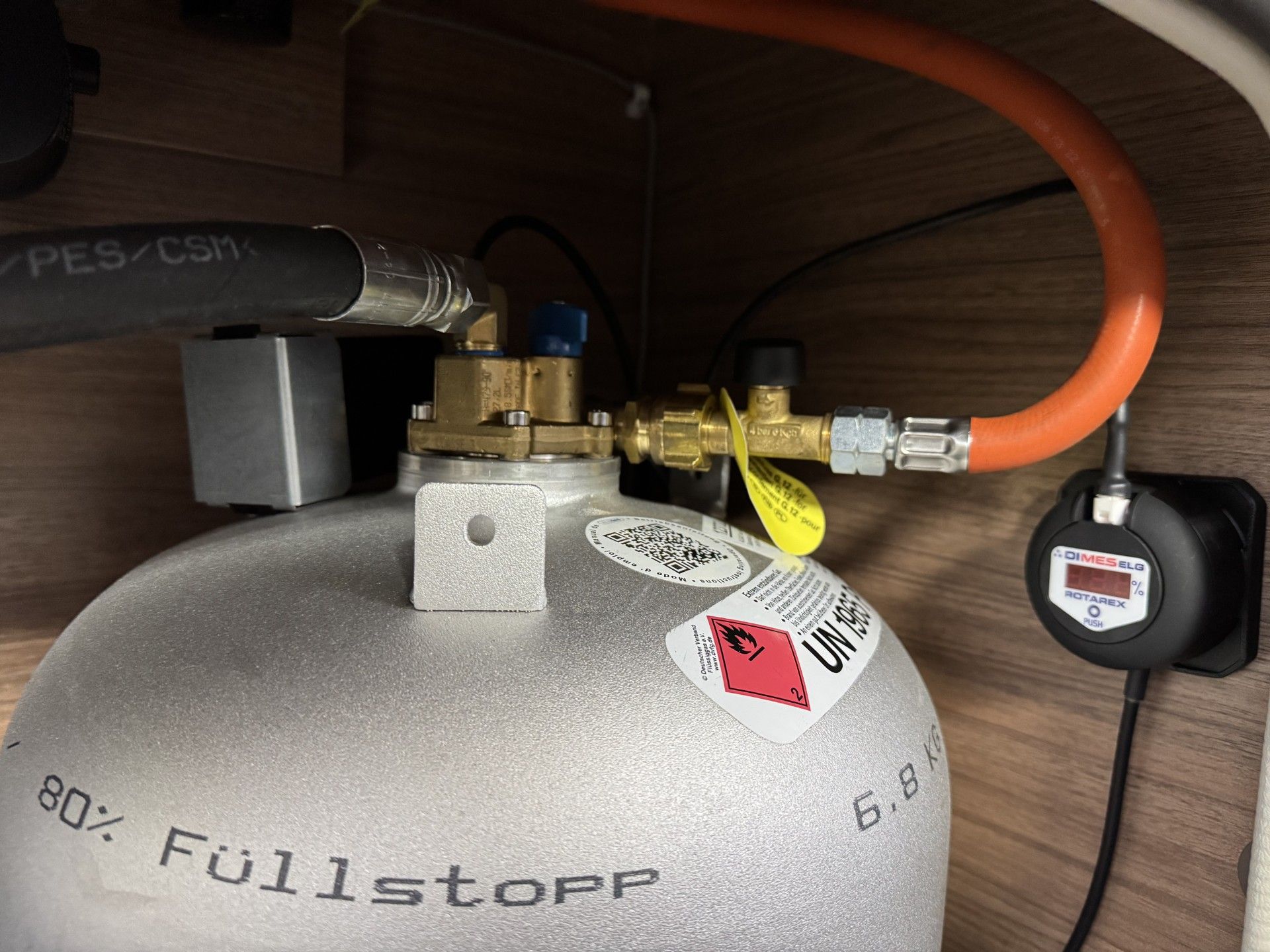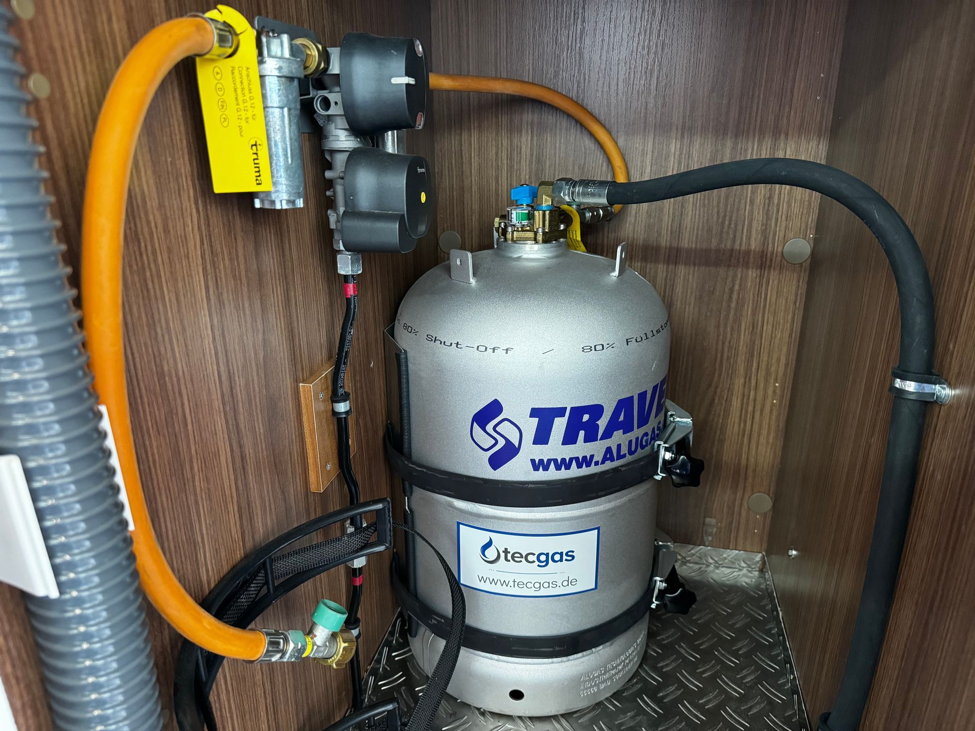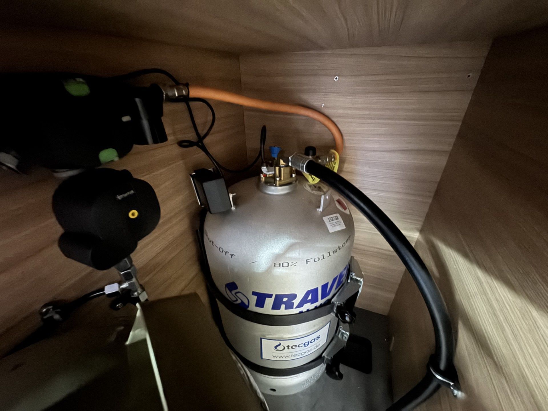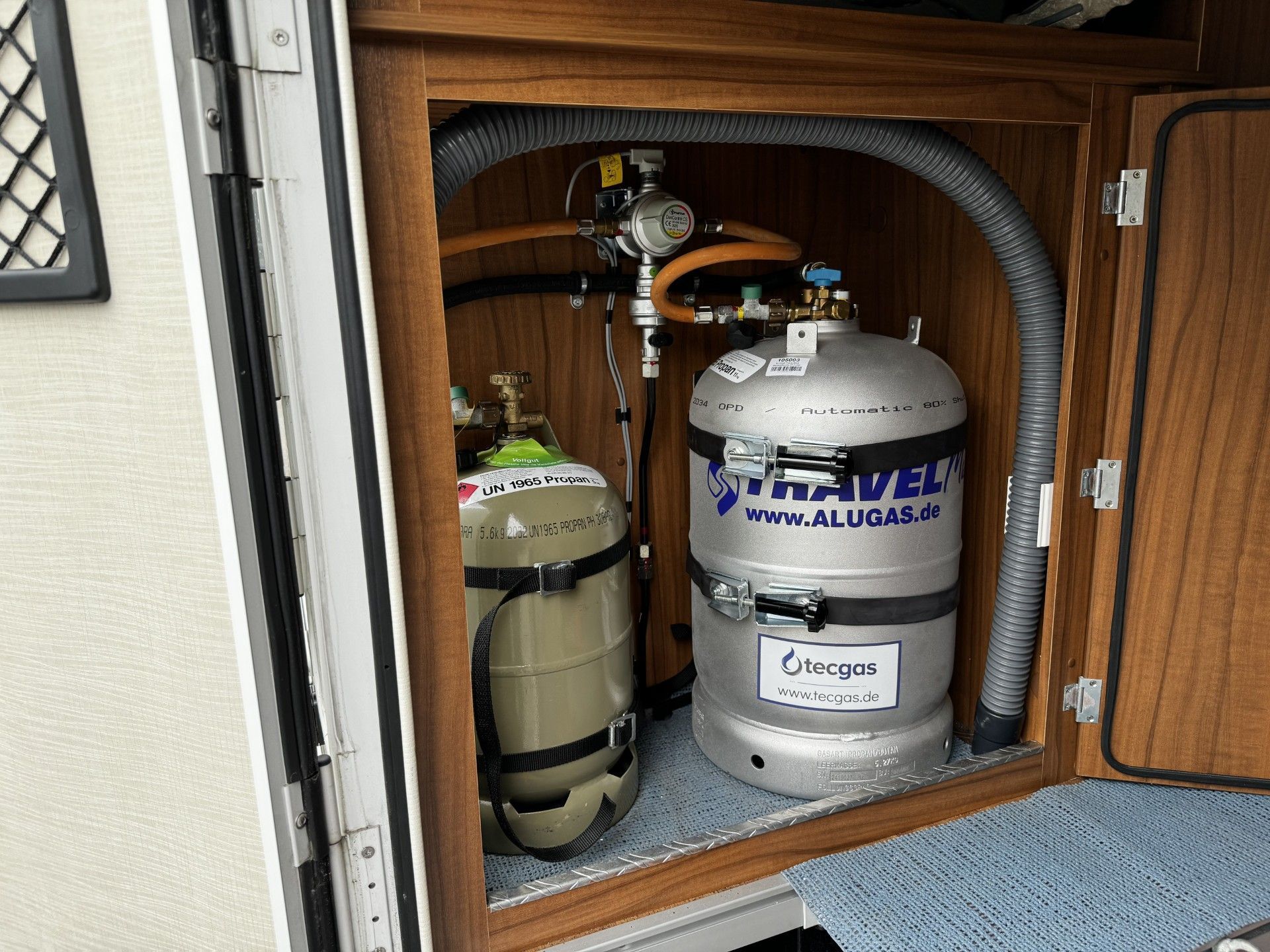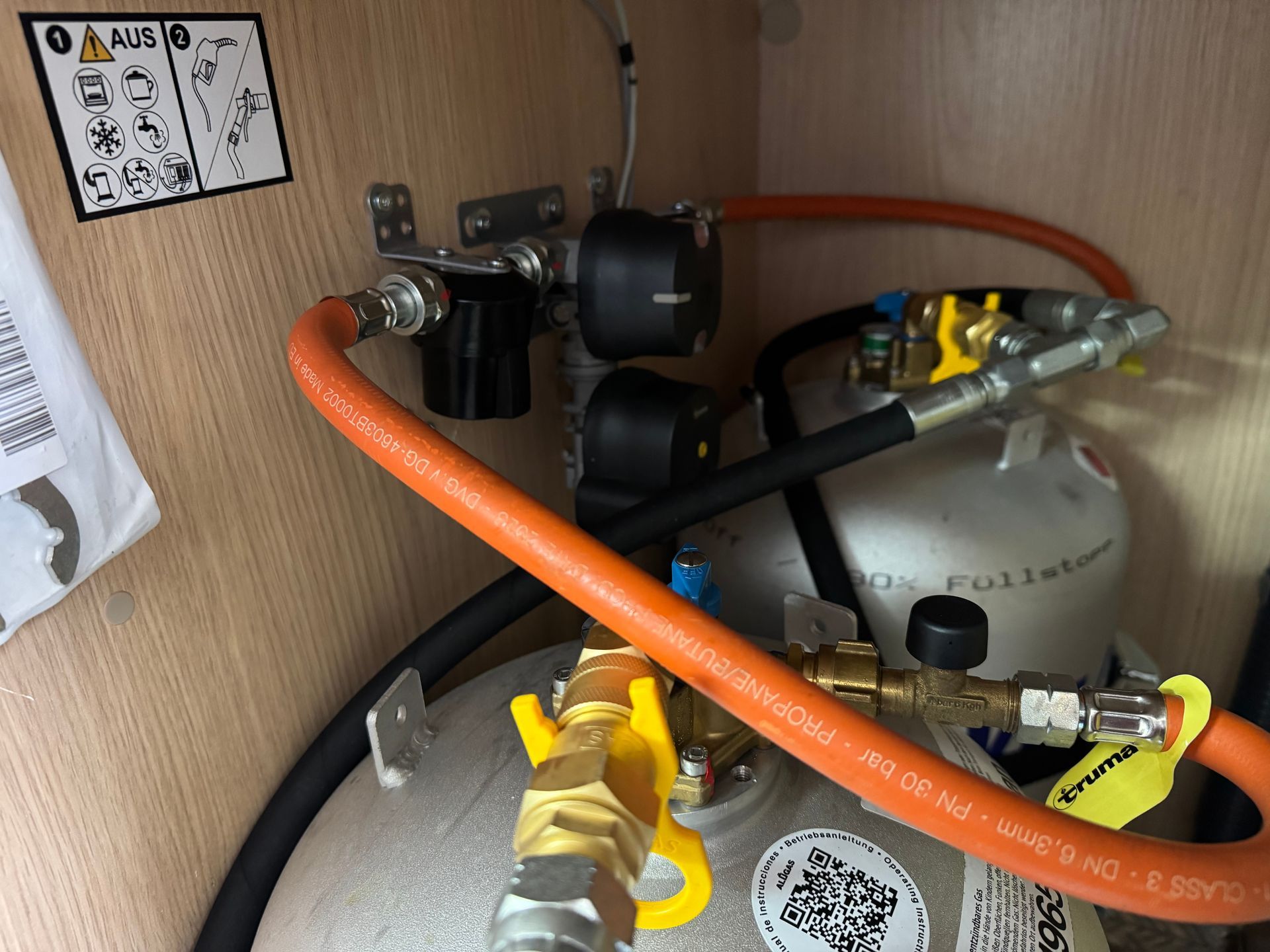 27,2 Liter Alugas TRAVEL Mate im Gaskasten zusamen mit einer Wechselflasche an der DuoControl angeschlossen.