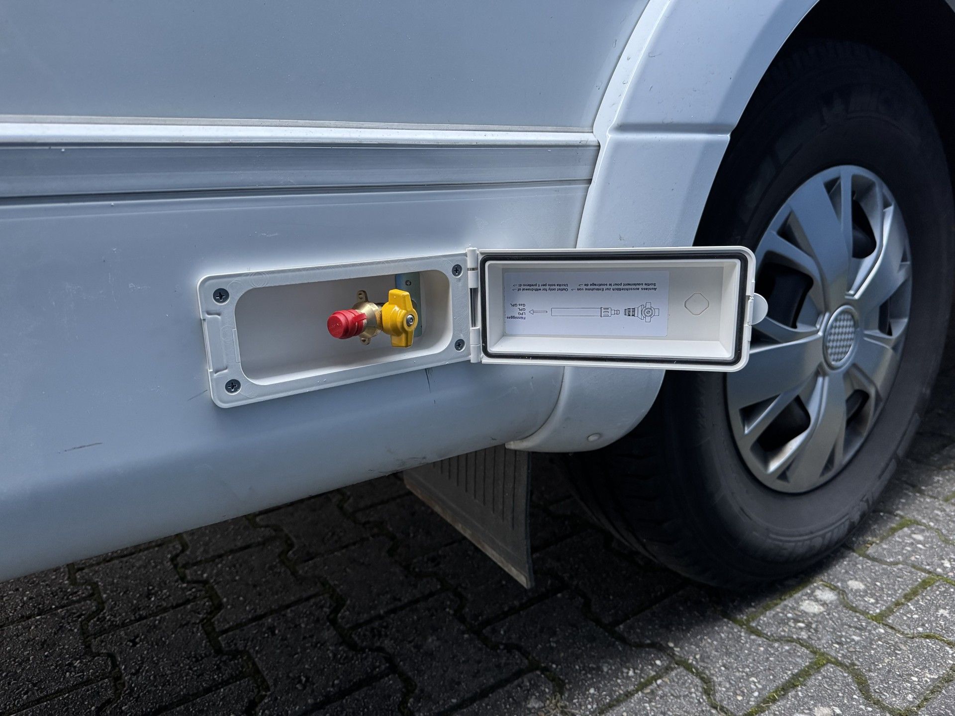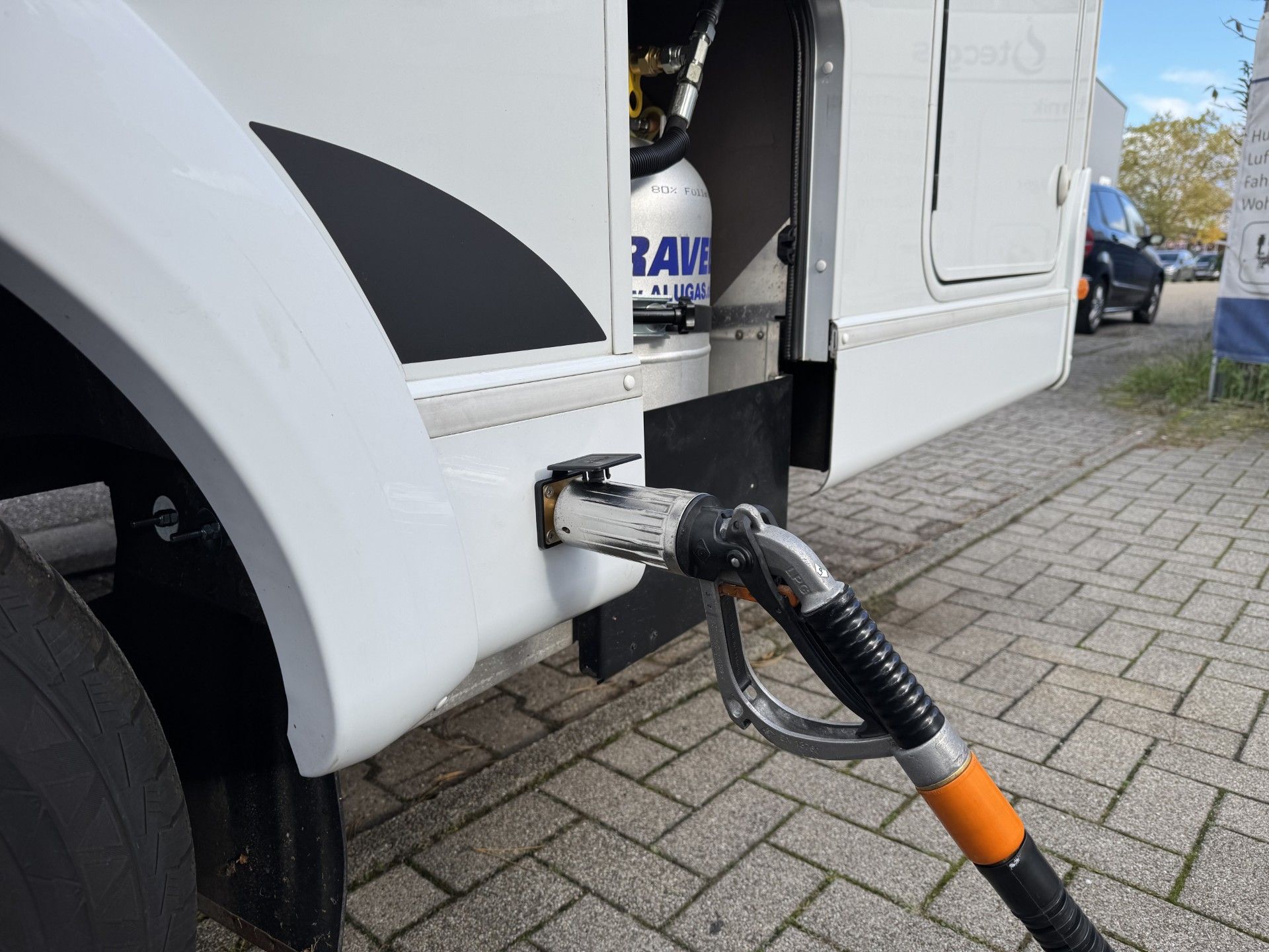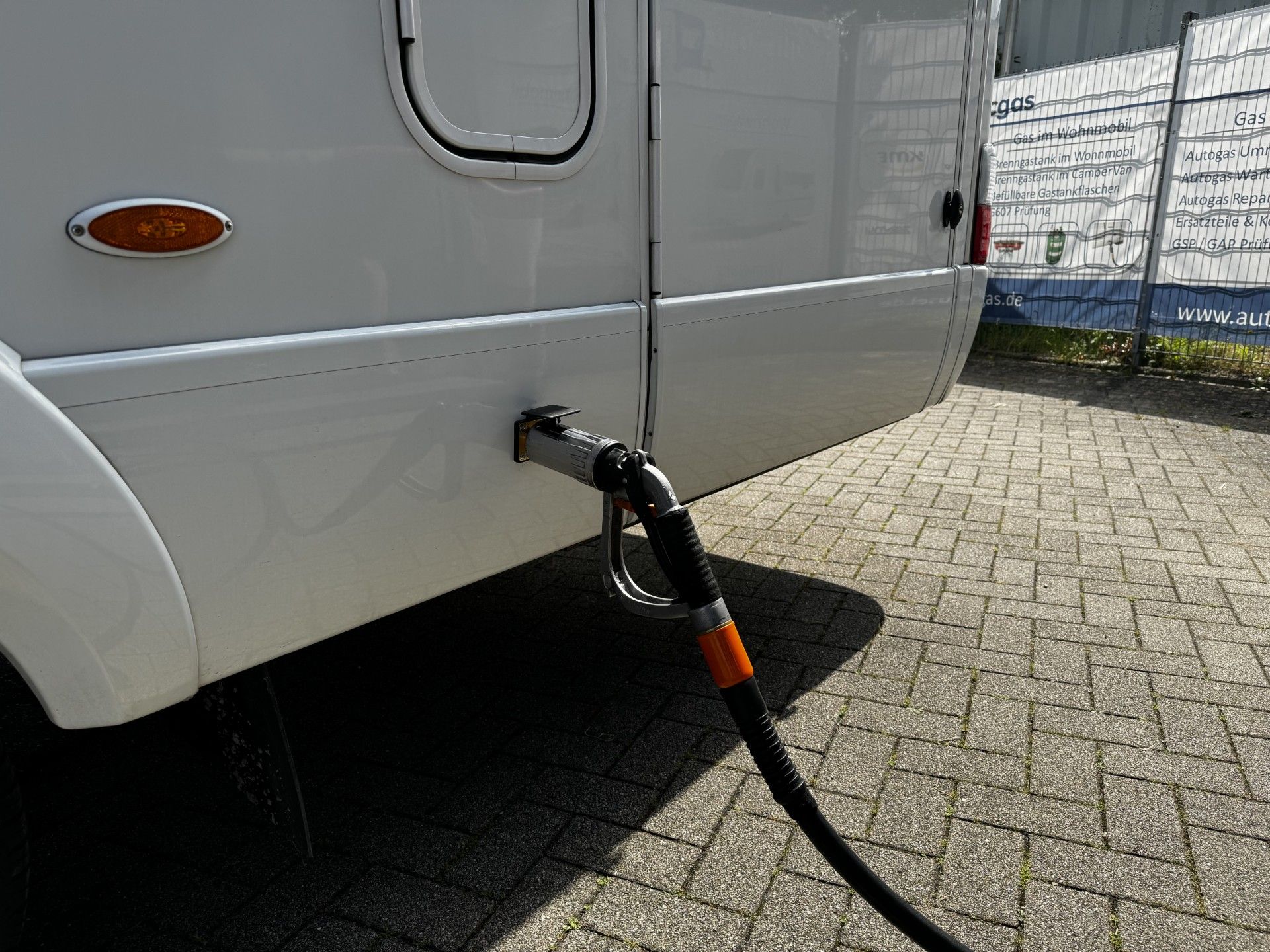 Alugas TRAVEL Mate 1.0 in der 14-kg-Variante verbaut. Damit verfügt der Kunde über einen Gasvorrat von netto 26,6 Litern, der sich bequem an mehr als 30.000 LPG-Tankstellen in ganz Europa auffüllen lässt – ganz ohne das mühsame Schleppen von Gasflaschen. Die Betankung erfolgt komfortabel über das in die Seitenschürze integrierte Füllventil. Für die Versorgung eines Gasgrills oder einer Außenküche wurde zusätzlich eine
