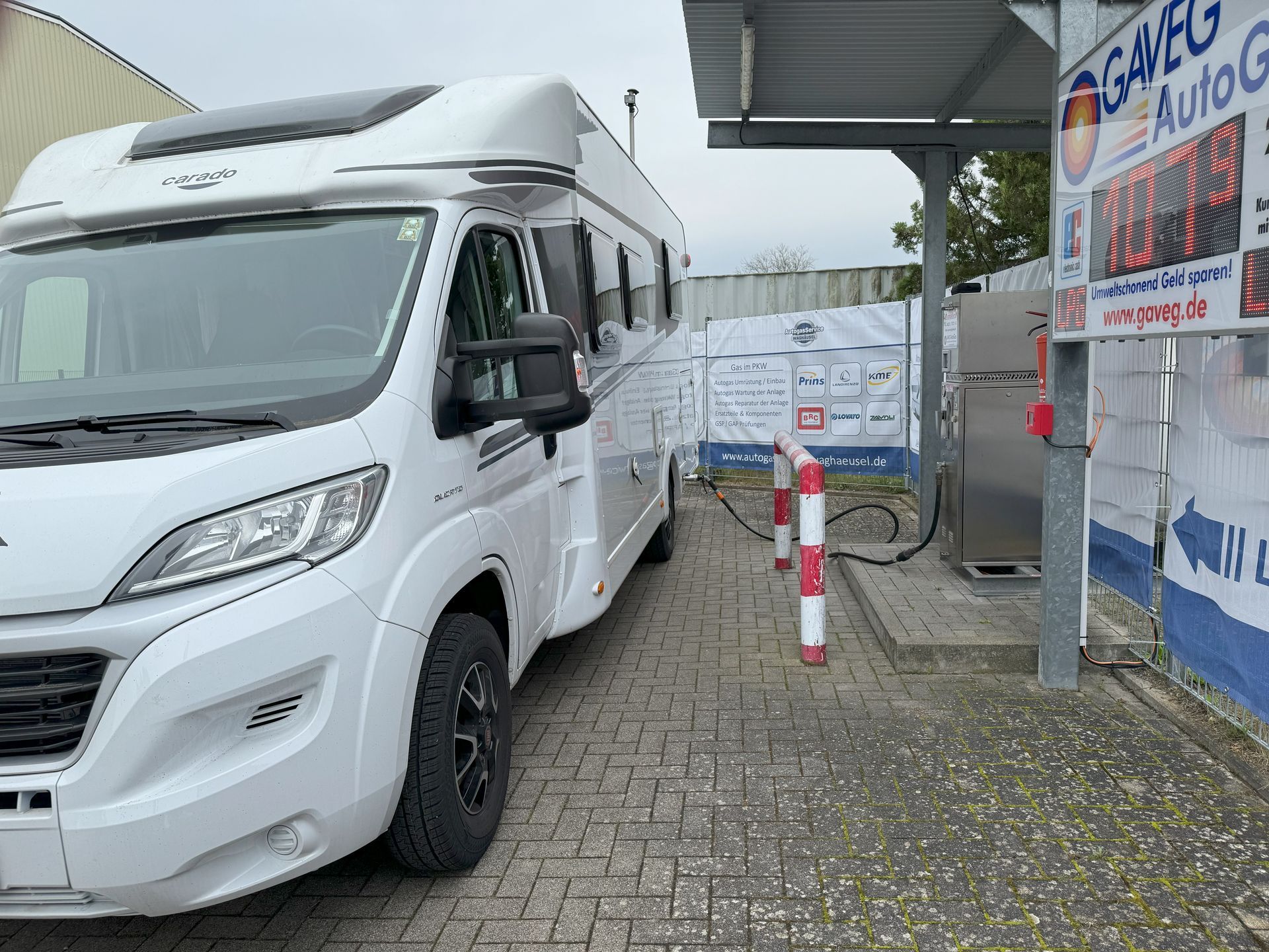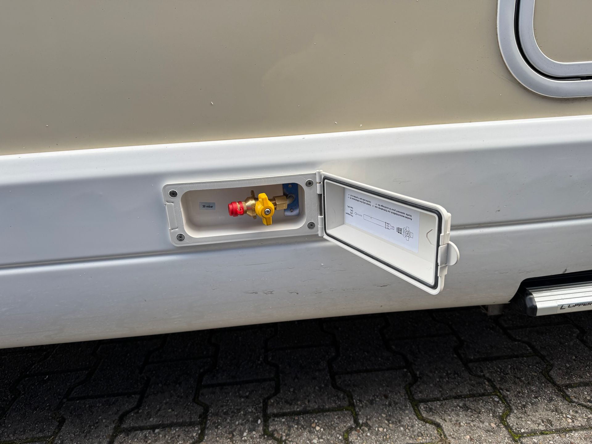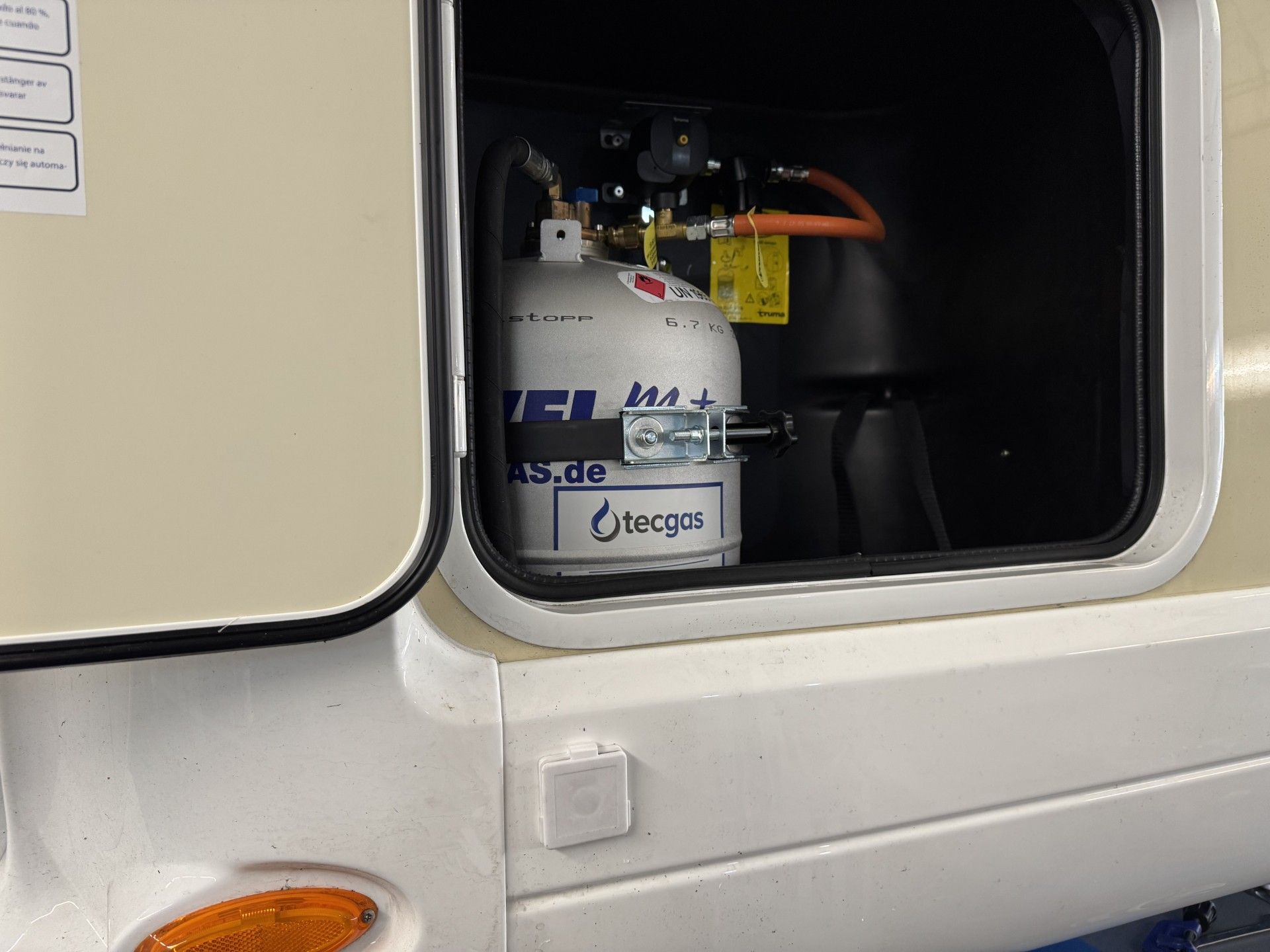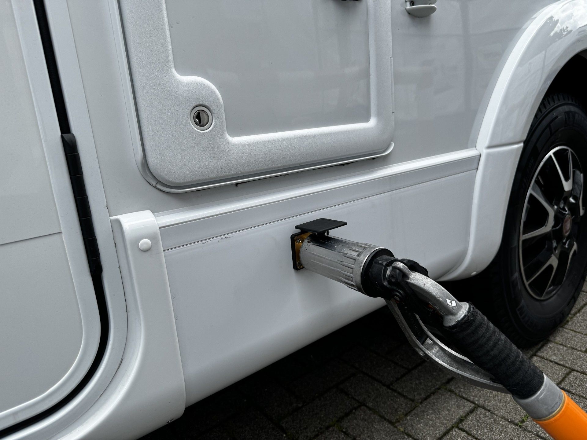 Alugas TRAVEL Mate 1.0 in der 14-kg-Variante verbaut. Damit verfügt der Kunde über einen Gasvorrat von netto 26,6 Litern, der sich bequem an mehr als 30.000 LPG-Tankstellen in ganz Europa auffüllen lässt – ganz ohne das mühsame Schleppen von Gasflaschen. Die Betankung erfolgt komfortabel über das in die Seitenschürze integrierte Füllventil. Für die Versorgung eines Gasgrills oder einer Außenküche wurde zusätzlich eine