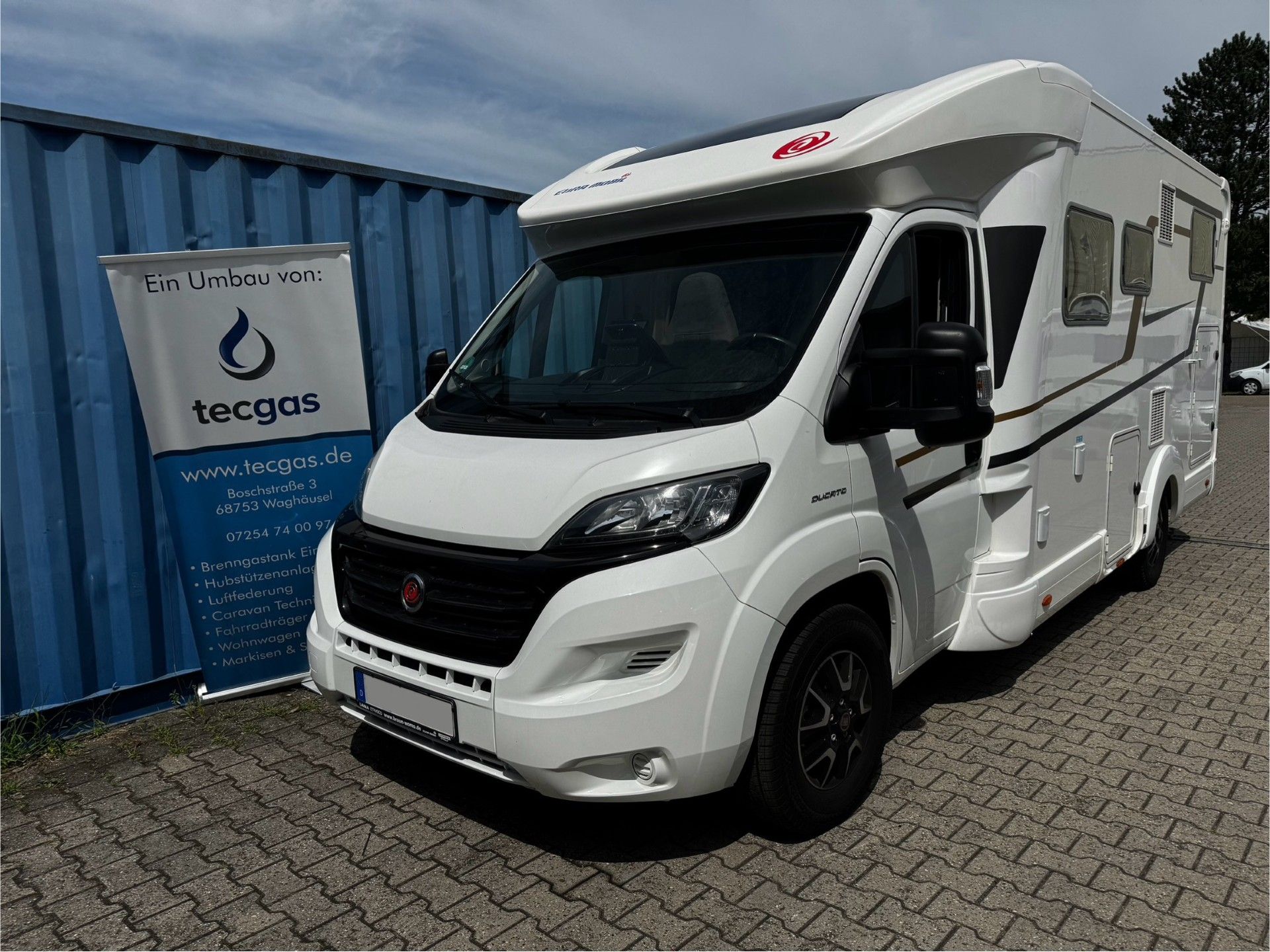 Bei diesem Fabrikneuen Pilote P696D wurden zwei Alugas TRAVEL Mate der neuesten Generation 2.0 vervaut. Dank des ELG Display an der Rückwand des Gaskasten, kann der Füllstand genau angezeigt werden. Darüber hinaus wurde das Truma DuoControl CS Komplett Set samt Filter und Hochdruckschläuchen mit Schlauchbruchsicherung verbaut