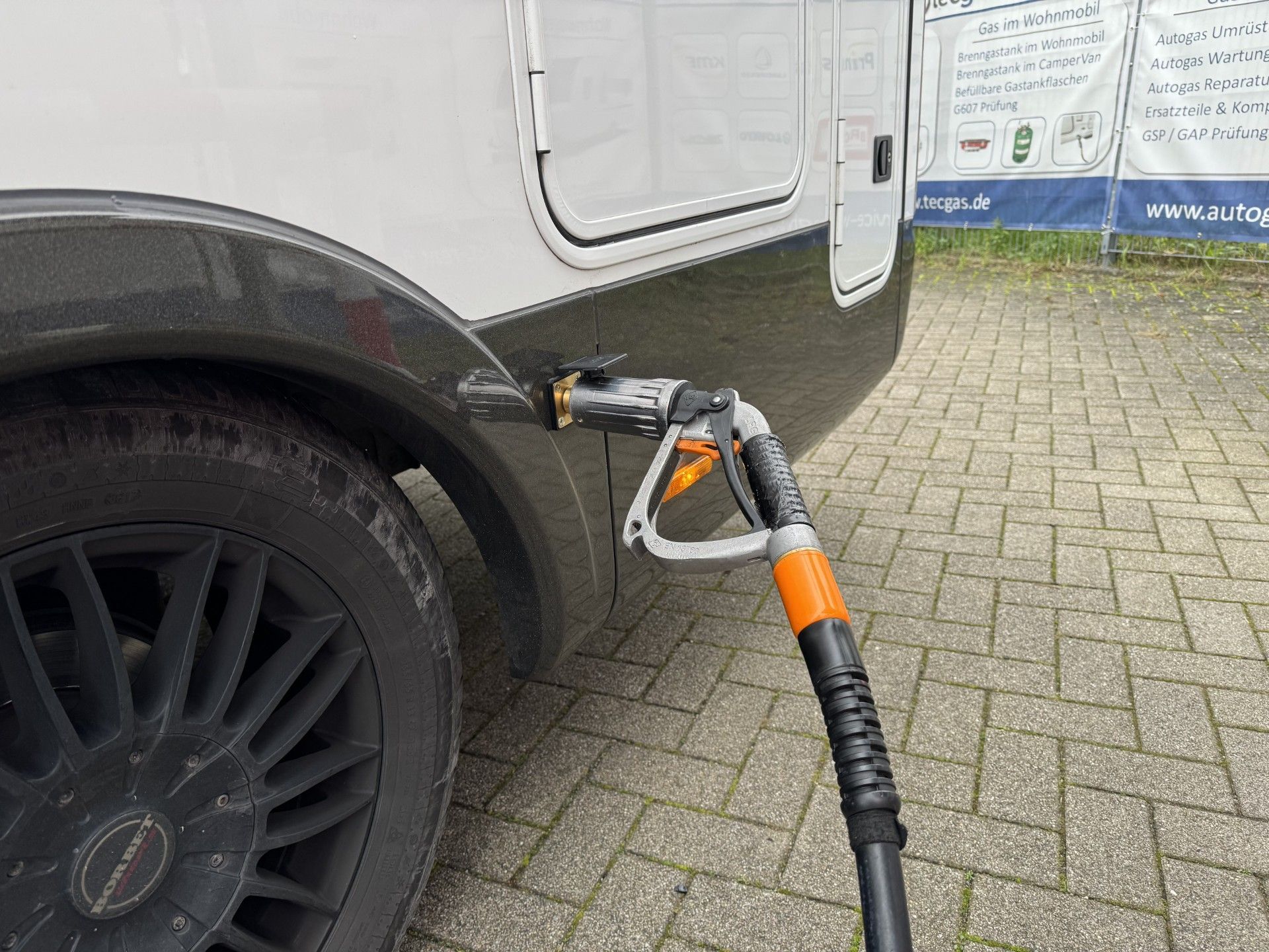 verbaut. Somit kann der Kunde seinen Gasvorrat von netto 43,5 Liter, bequem an über 30.000 LPG TAnkstellen in Europa auffüllen und kann auf lästiges Flaschenschleppen verzichten. Die Betankungs erfolgt komfortabel über das Betankungsventil in der Seitenschürze. Das Europa Adapter Set erhalten Sie bei einem Einbau bei uns natürlich hinzu.
