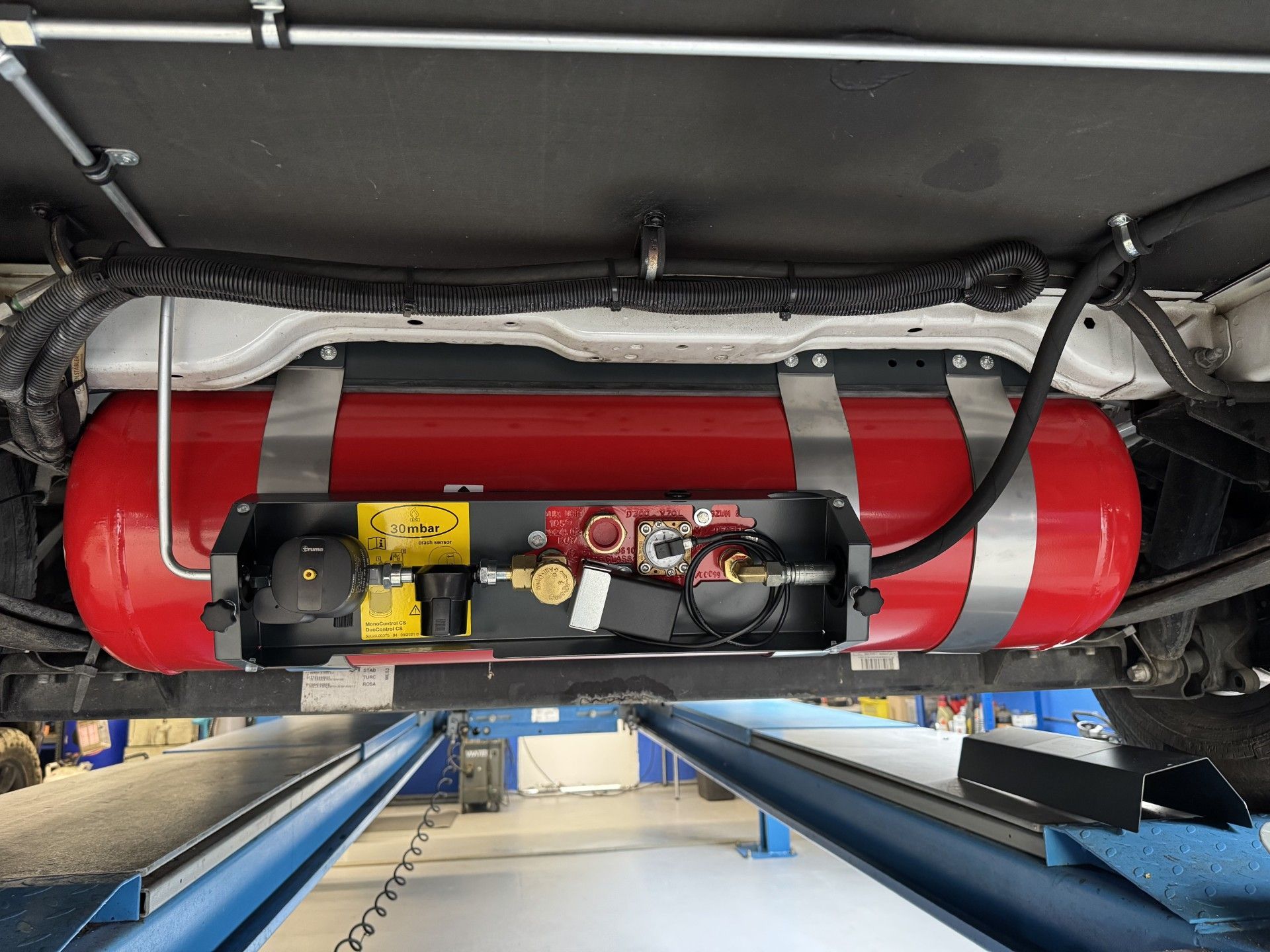 Die Befestigung erfolgt über einen mittig im Fahrgestell verschraubten individuell angefertigten Halter, der an den vorhandenen Bohrungen angebracht wird. Der Tank wird anschließend an diesen Hilfshalter montiert. Zwischen der Gasentnahme und dem Druckminderer wird ein Gasfilter von renommierten Marken wie GOK oder Truma eingesetzt, um die Gasqualität zu sichern. Der Druckminderer ist zudem mit einem Crash-Sensor ausgestattet, der eine sichere Gasentnahme während der Fahrt ermöglicht. Optional kann ein Eis-Ex für den Betrieb bei niedrigen Temperaturen hinzugefügt werden.
