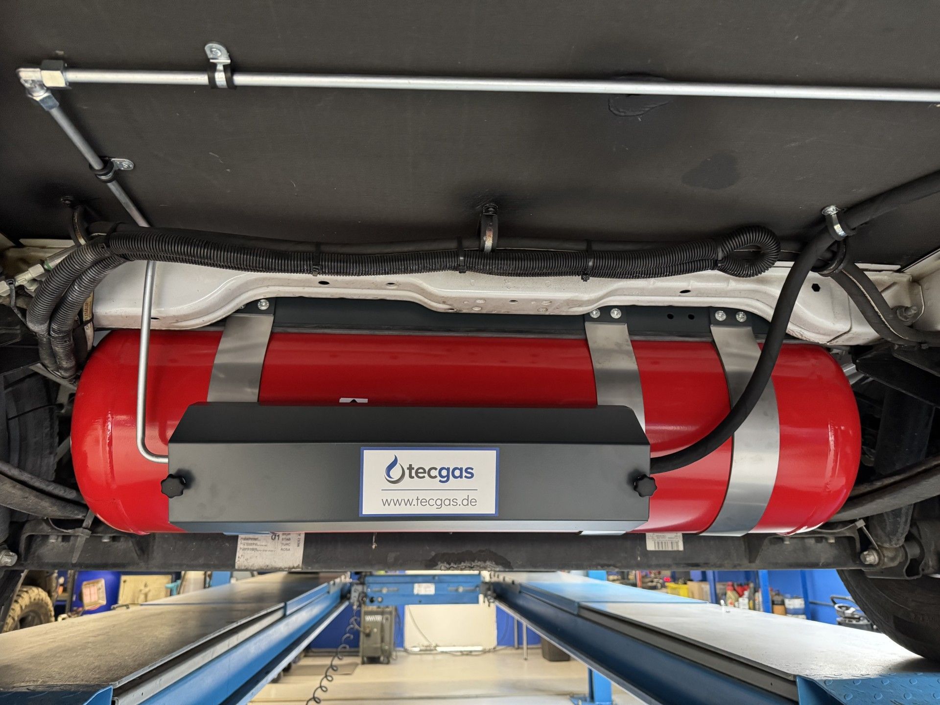 Wir verwenden einen speziell entwickelten Tankhalter der Firma AST, der ohne zusätzliche Bohrungen im Fahrzeugrahmen montiert wird. Dadurch bleibt die Struktur Ihres Fahrzeugs intakt, während gleichzeitig ein großer 70-Liter-Zylindertank sicher befestigt werden kann.