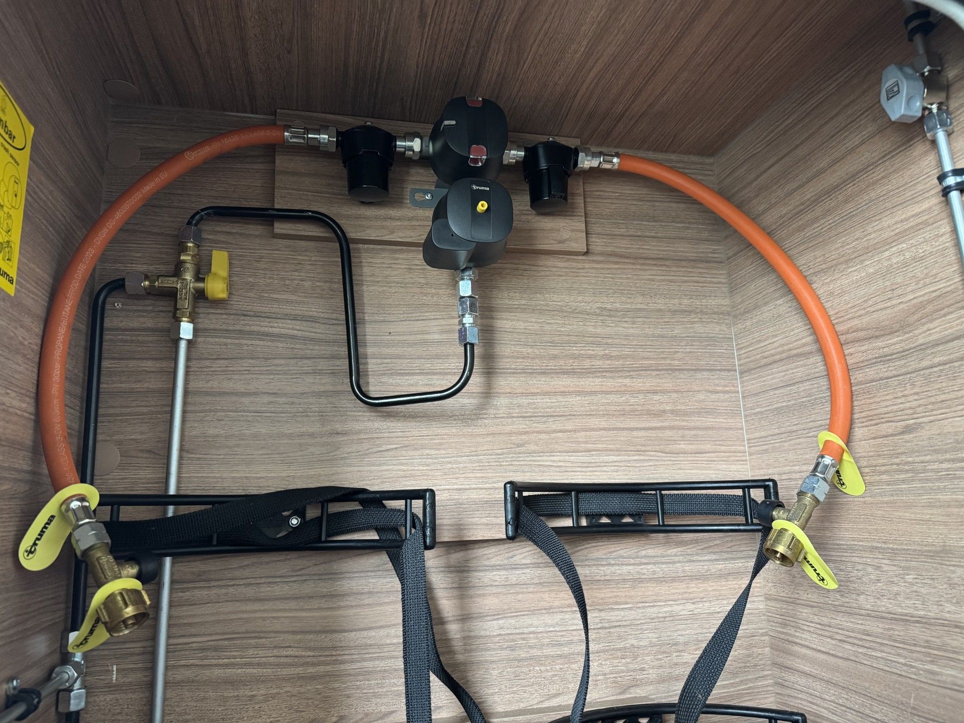 Am Gastank muss ein Druckminderer direkt angeschlossen werden, von dem eine feste Verrohrung abgeht. Hochdruckschläuche sind nicht erlaubt. Bestehende Druckregler wie Mono- oder Duo-Control können nicht verwendet werden.